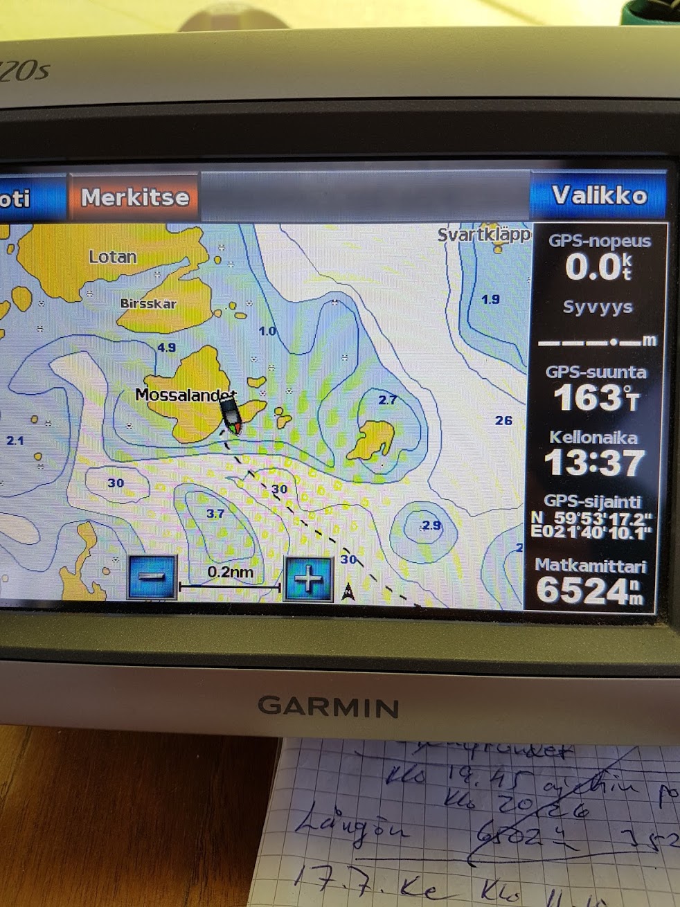 Jostain syystä plotteri ei näytä koneen käymättä aina syvyyttä, (temppuilee se syvyyslukema muutenkin), mutta oli 4.1 metriä perän alla vettä.