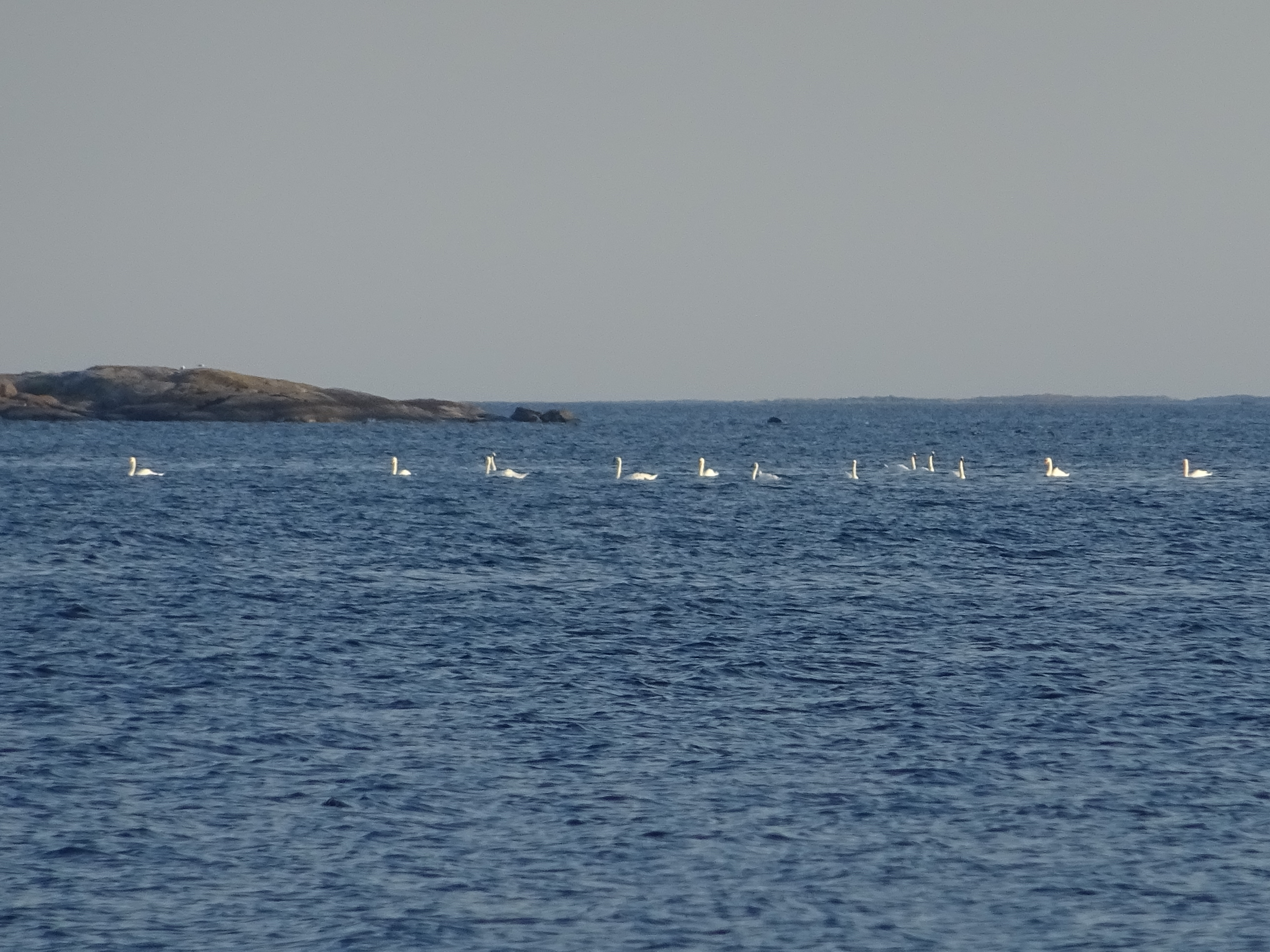 Vähän ennen tulevaa rantautumispaikkaa, pikkuluodolla oli hylkeitä, 4-5 sukelteli. Toisella puolella pikkusaaren rannalla 20-30 joutsenta. On täällä elämää ja me vieraslajeina häiritsemässä.