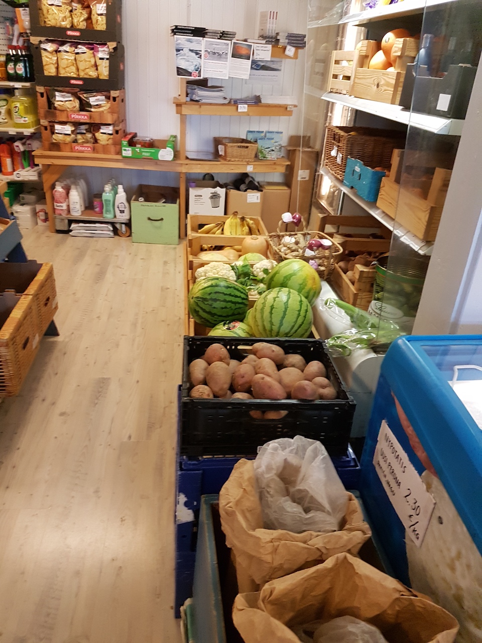Sitten kauppaan. Mielestäni kauppa on saanut ”kasvojen kohennuksen”. Tosi siisti sekä valikoima varmastikin yksi laajimpia saaristokaupoista. Hyvä niin, meille veneilijöille, puhumattakaan paikallisista. Niitähän on näin kesäisin saarella ilmeisen paljon.