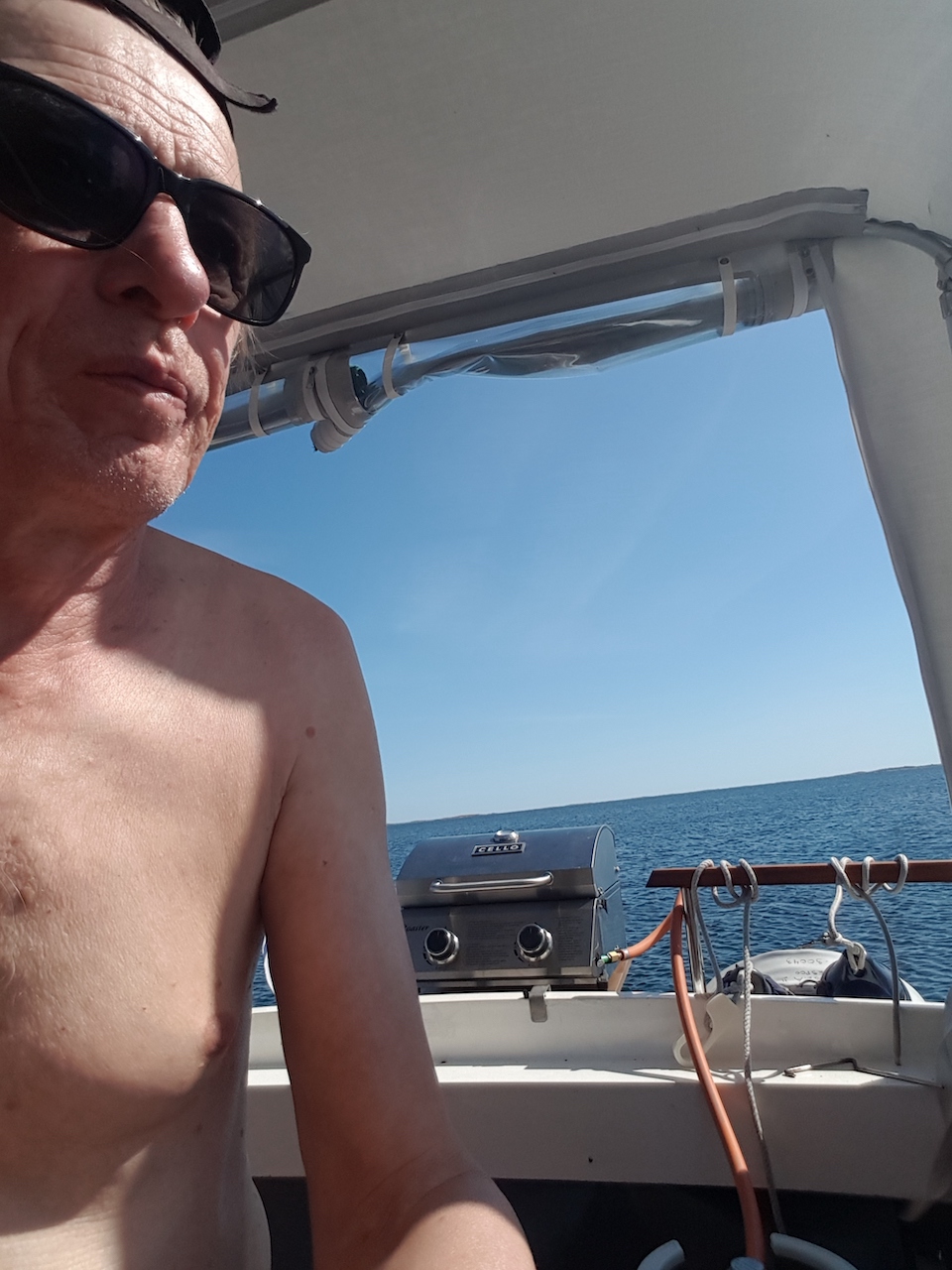 Ensimmäinen kerta tällä reissulla, kun Kippari uskaltautui, ei, ei uimaan sentään, vaan täällä ulkomerellä ilman paitaa.