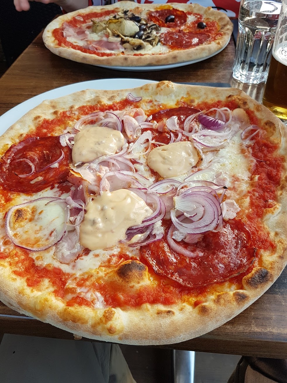 Paikaksi valittiin n 150 metrin päässä oleva Pizza Diablo. Kuuluu tod näk kimppaan Kino Nightclubin kanssa, koska kuitissa lukee Kino Nightclub. Ihan sama, koska pizzat olivat todella hyviä ja isoja.