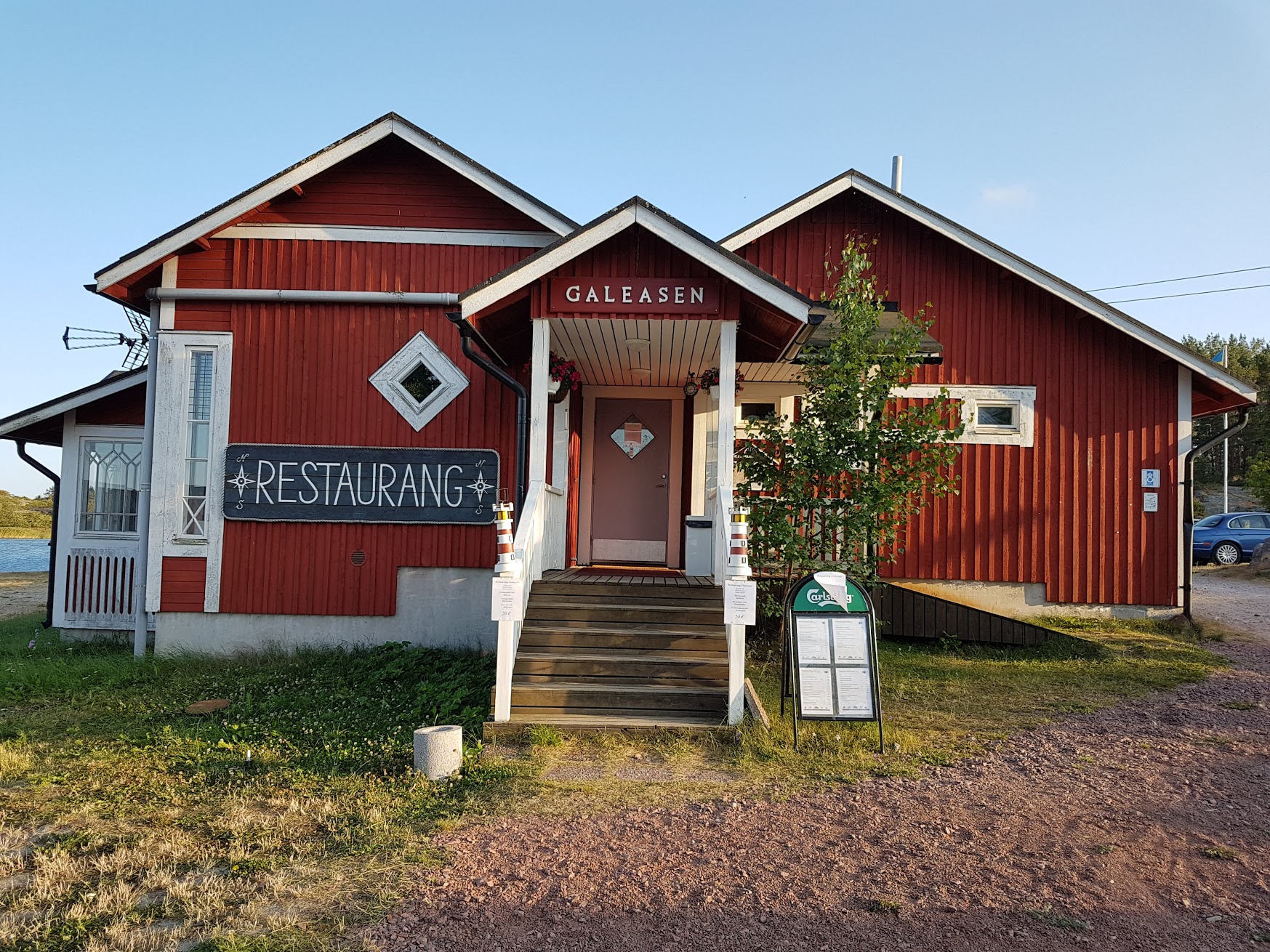 Satamassa Restaurang Galeasen (Pisimmän galeassin pituudeksi mainitaan 145 jalkaa. Galeasseissa keulaan sijoitetut tykit osoittivat niin eteenpäin). Piti luntata, mitä tarkoittaa ravintolan nimi.