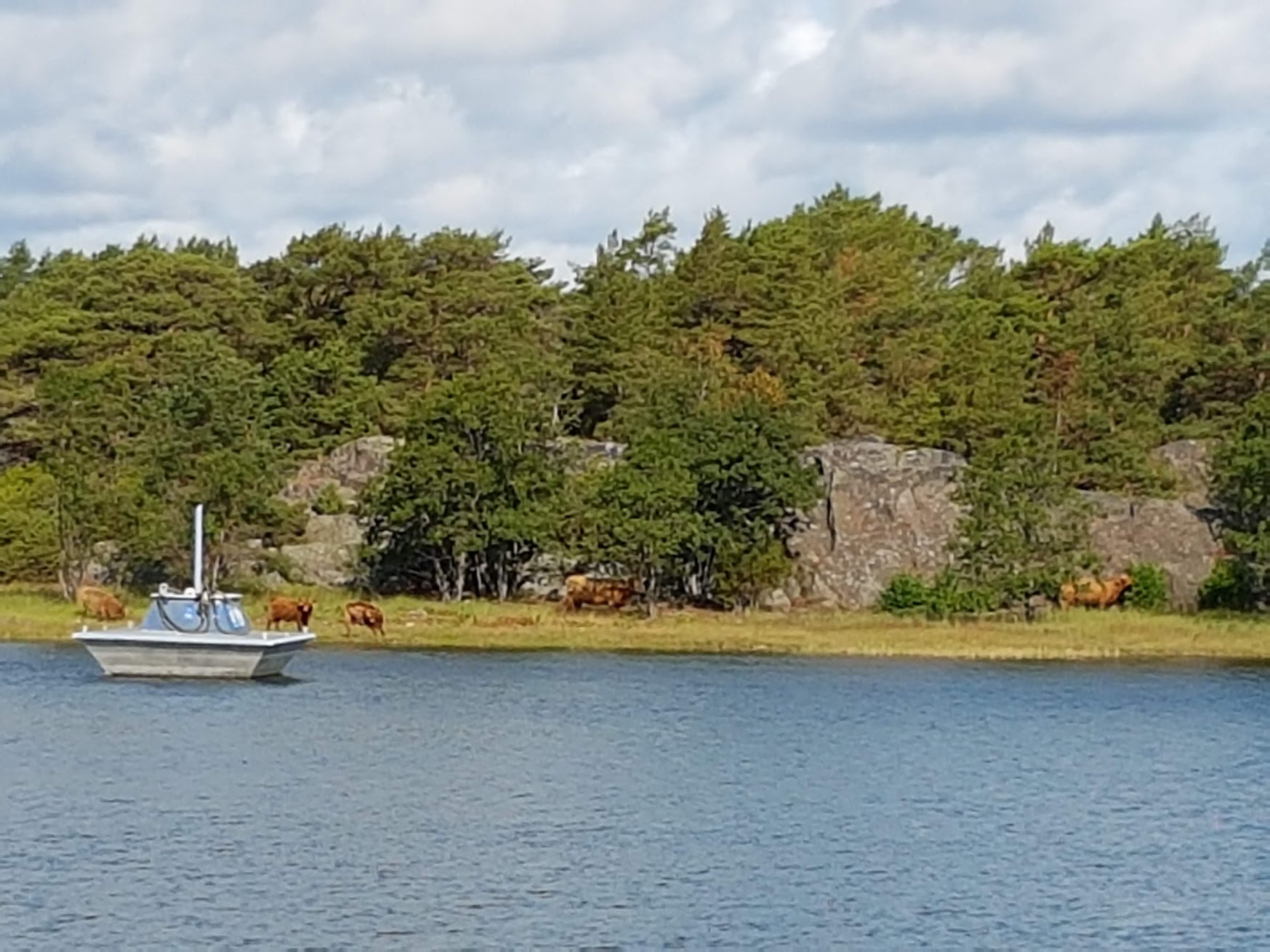 Joku hiffasi aamulla, että vastarannalla on lehmiä. Me nähtiin yhdeksän ammua, mutta ei tullut kysyttyä satamamestarilta, paljonko niitä kaikkiaan on.