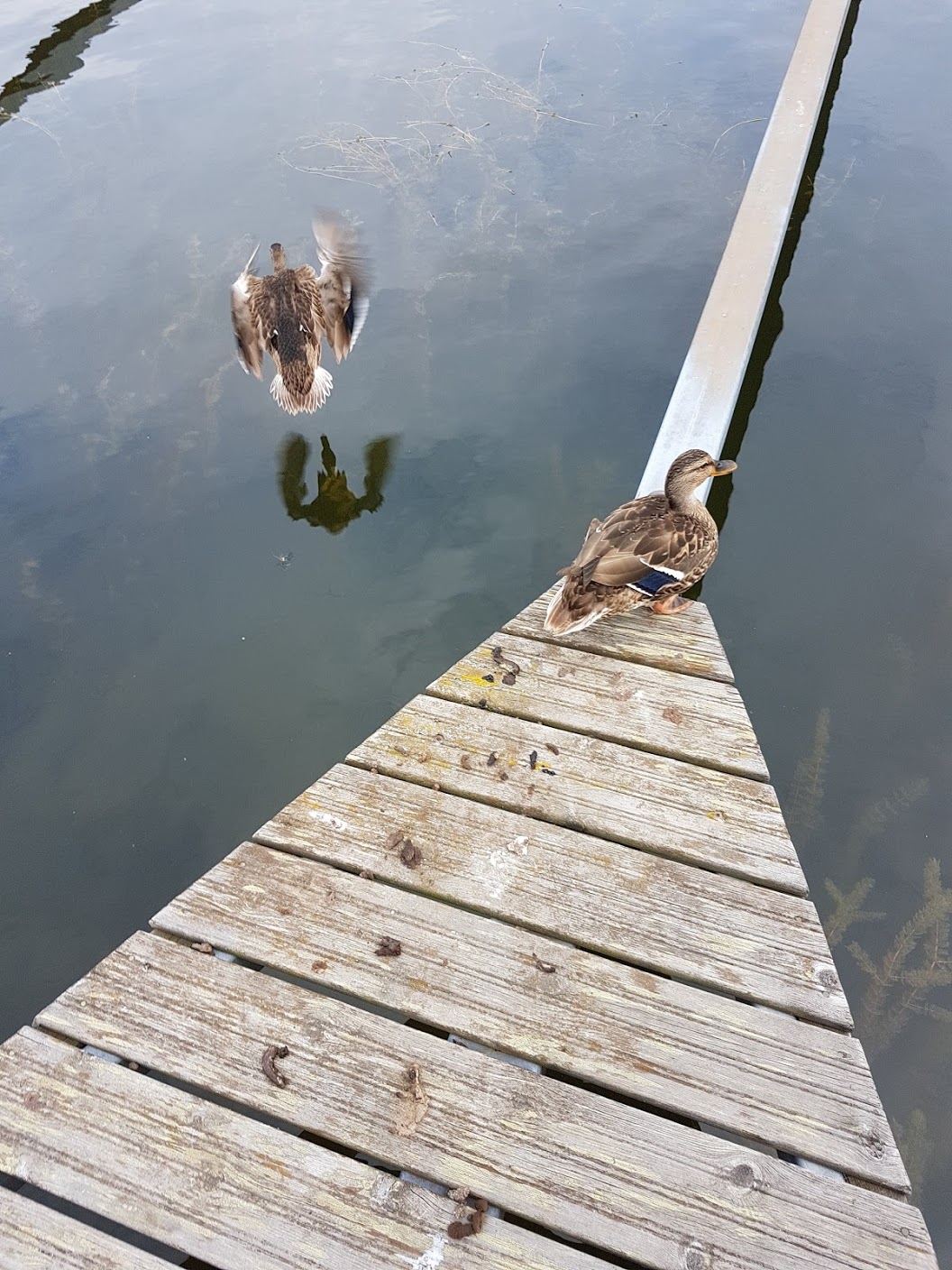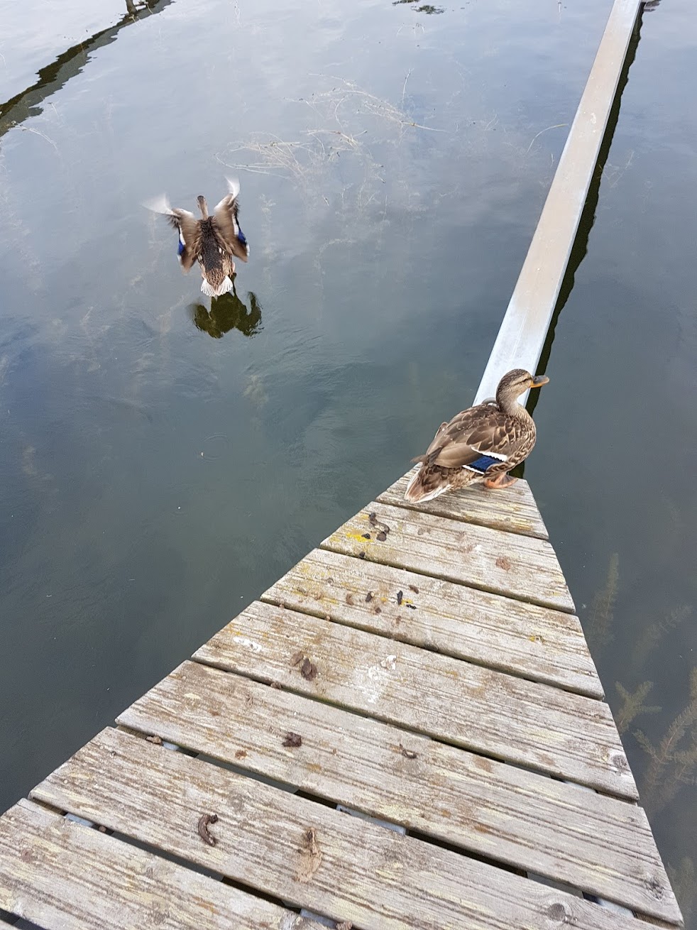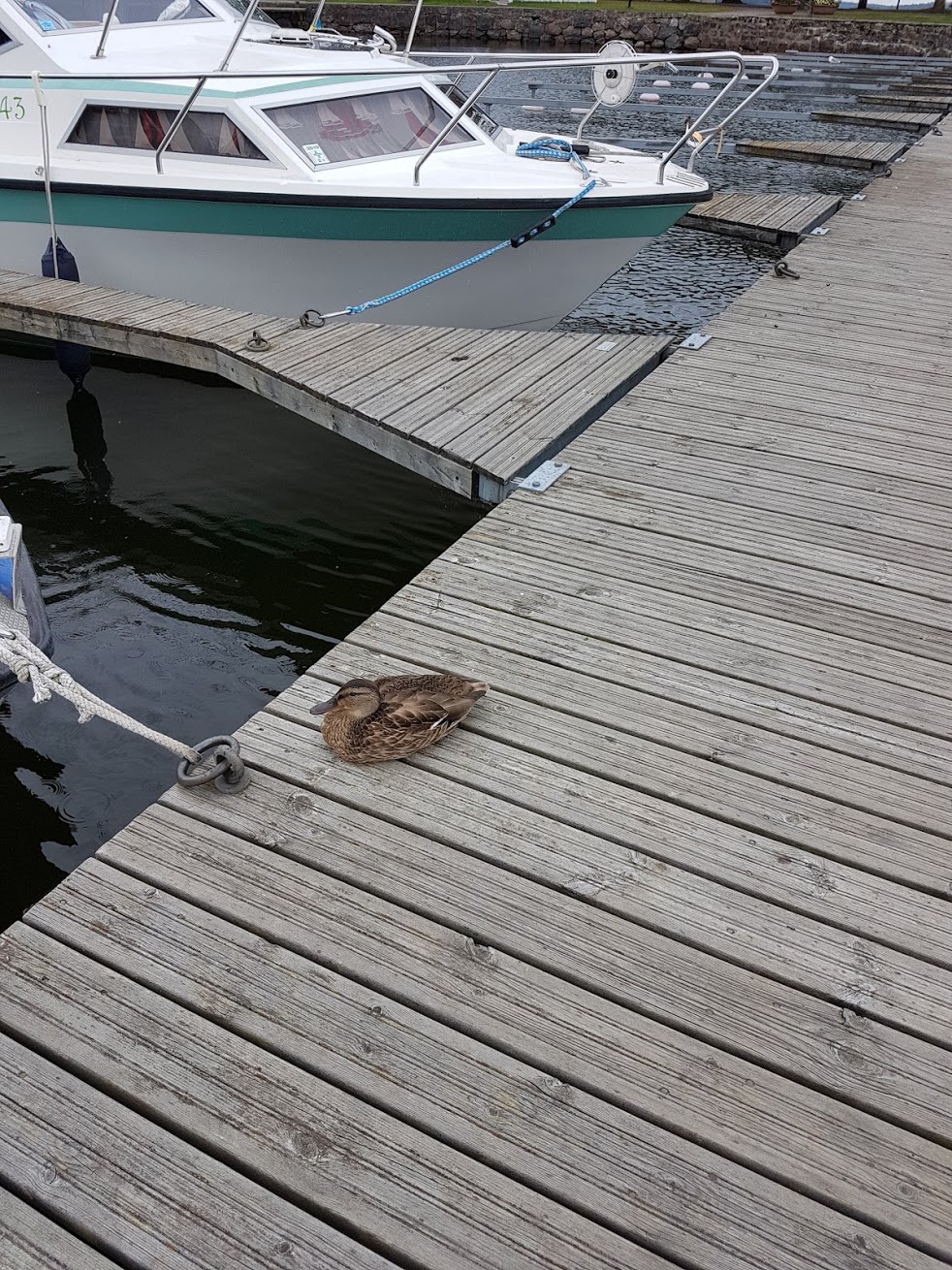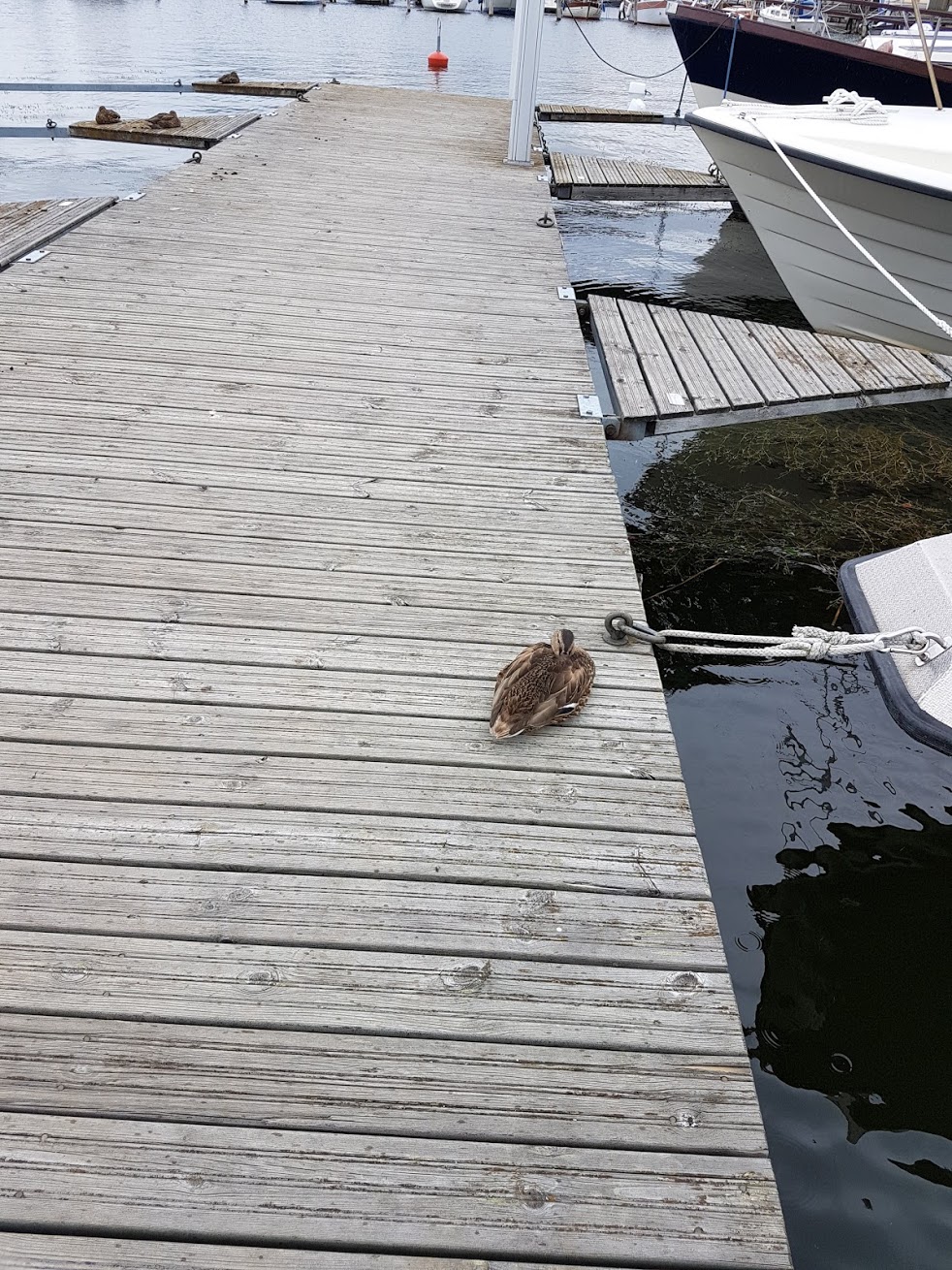 Perillä laiturilla oli sorsa, joka ei ollut moksiskaan meidän tulosta ja köysien kiinnittämisestä, vaikka ihan vieressä olikin päivätorkuilla.