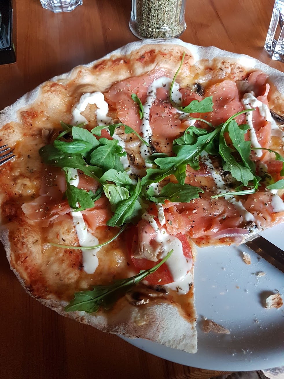 Mulla merihenkisesti kylmäsavulohta vähän muuta ja Madam ilmakuivattua kinkkua ja vähän muuta. Pohja todella rapea ja koko tuote silti ei yhtään kuiva vaan mehukas, joka silti ei lillunut soosissa.