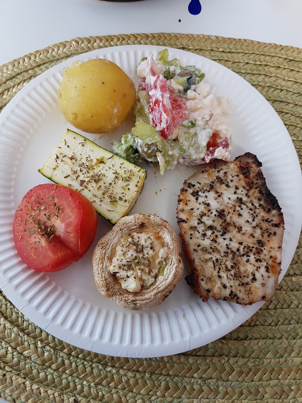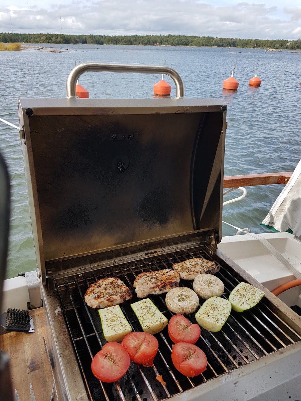 Sitten olikin grillauksen vuoro. Tällä kertaa grilli piti laittaa sisäpuolelle, ettei kantta avatessa olis joutunut tyhjää ritilää toljottamaan, puuskainen tuuli sivulta olisi sen varmasti tehnyt.