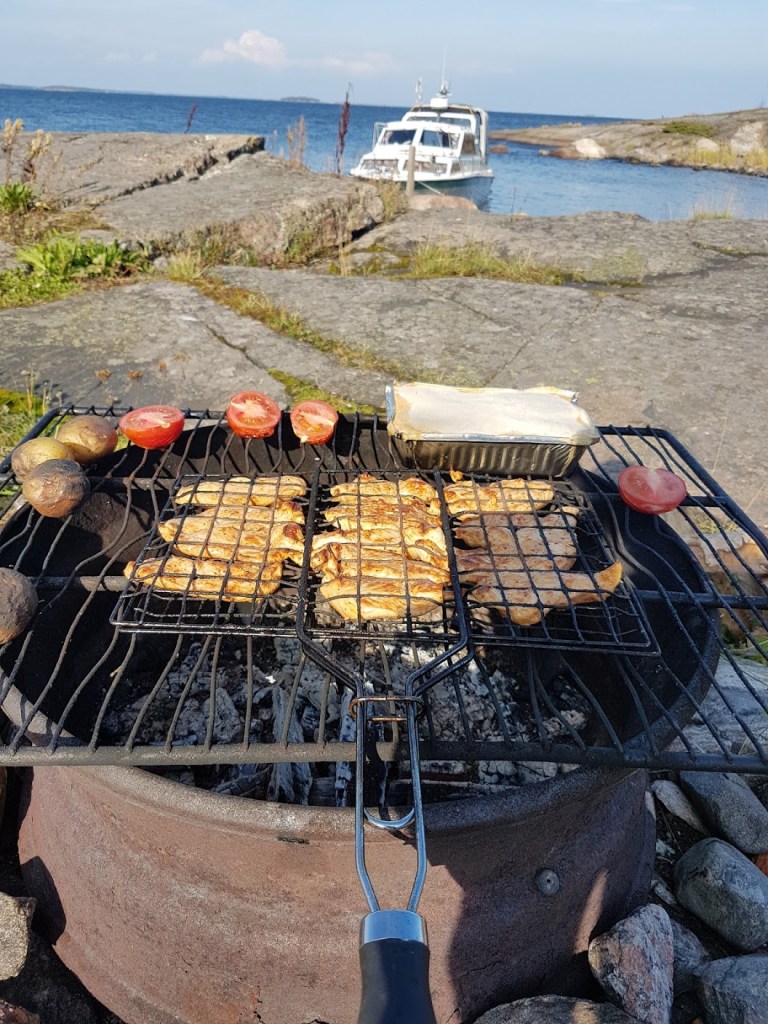 Kun se viimein syttyi uudelleen, yhden tikkuaskin tuhlanneena, juurekset pilkottuna ja vuuassa alkoivat olla kypsiä niin oli broiskun sisäfileiden vuoro päästä hiillokselle.