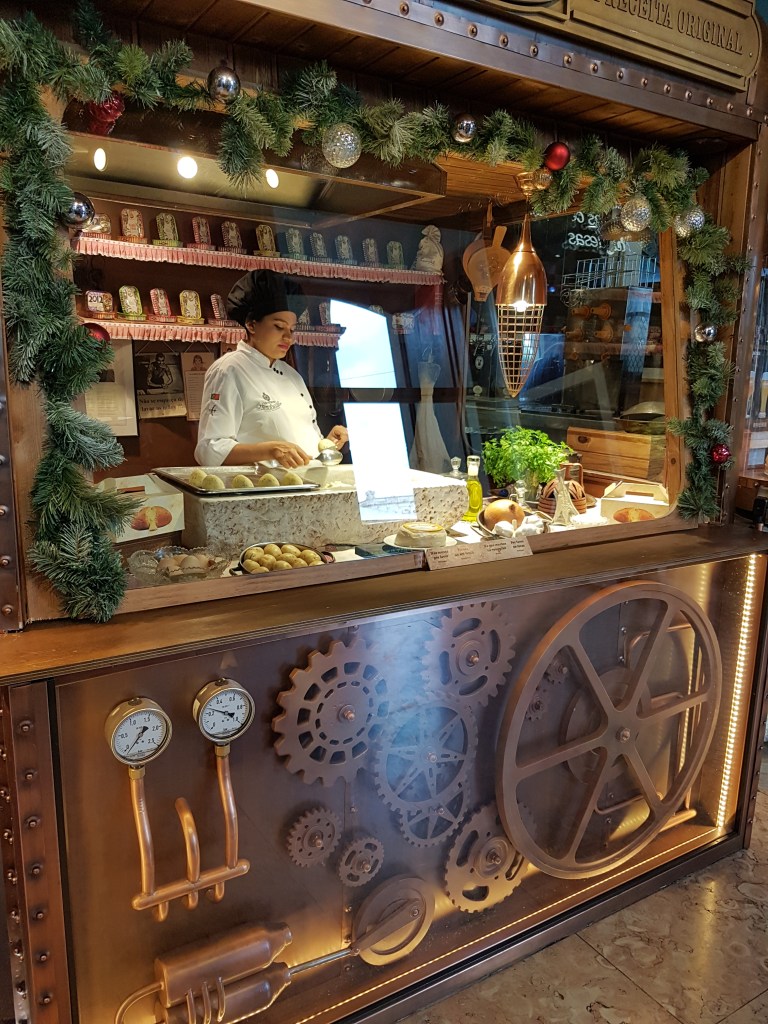 Rantaan päin mentäessä, oli vanhan hallintorakennuksen alakertaan tehty ”pari” ravintolaa, joissa yhdessä oli tällainen kokin nurkkaus, missä tämä ”väänsi” jotain uppopaistettavia lusikalla.