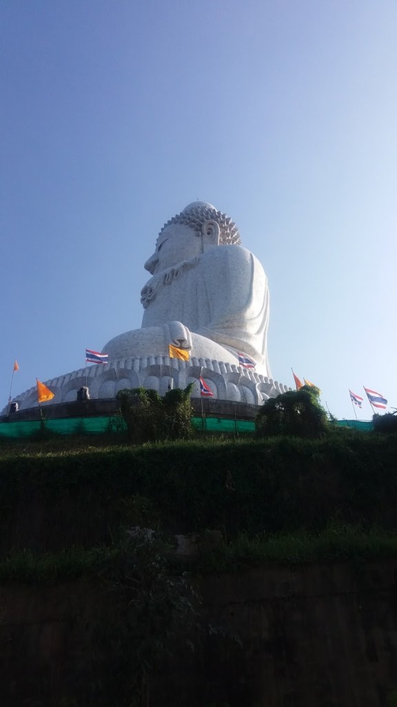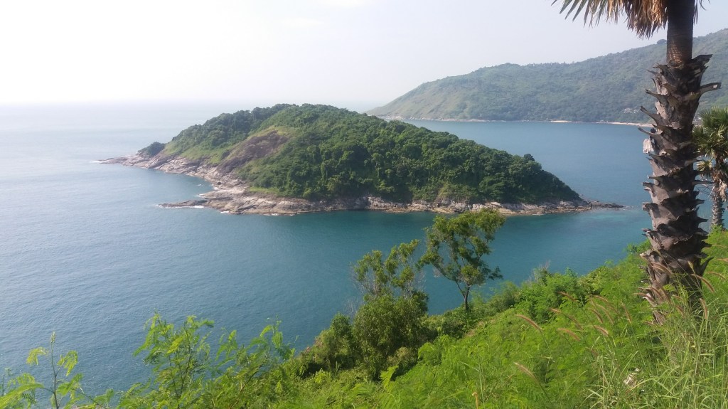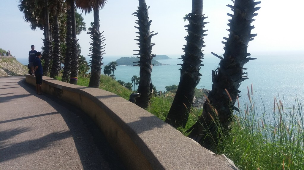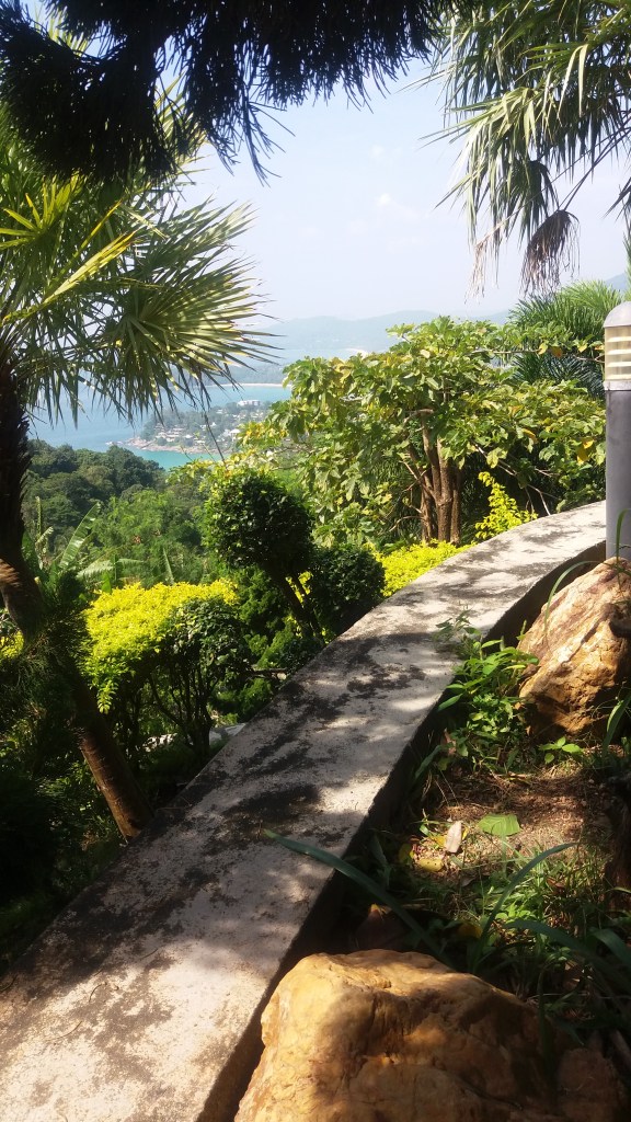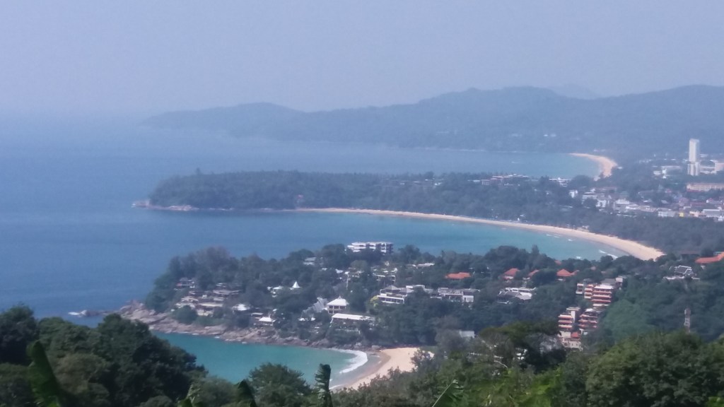 Aamupala oli jo astetta monipuolisempi edelliseen majoitupaikkaan verrattuna, joten nälän tunteen sai siirrettyä oikein hyvin iltapäivään. Kokoonnuimme altaalle vajaaksi kahdeksi tunniksi. Oli tarkoitus lähteä retkelle, jonka ladyt olivat käyneet ostamassa meille. Lähtö olisi hotelliltamme klo 13:00. Eipä ollut. Kun auto viimein tuli puoli tuntia myöhässä, selvisi, että oli odottanut edellisessä noutopaikassa muutamaa leidiä, jotka ei kuitenkaan olleet ilmaantuneet paikalle. Siispä lähdimme ilman heitä, hukaten jo lähdössä aikaa ihan liikaa.Auto oli Hiacen pikkubussi, johon mahtui 12 kyytiläistä. Ensimmäinen pysähdyspaikkamme oli joku näköalapaikka. Näkihän sieltä hienosti alas rannoille. Oisko ollut Karon beach ja joku toinen, tuo kauimmainen oli Patong beach. Nämä jääneet tyttöset, heidän piti tulla tänne toisella taksilla, joten jäimme odottamaan. Taas meni melkein puolituntia ….. Ei tullut tyttöjä …. Jatkoimme jollekkin toiselle näköalapaikalle, melkein saaren eteläkärkeen. Nyt tyttöset liittyivät joukkoomme.Täällä ei ollut näköpiirissä taloja tai hiekkarantoja, mutta muuten maisema oli enempi kuin hieno.