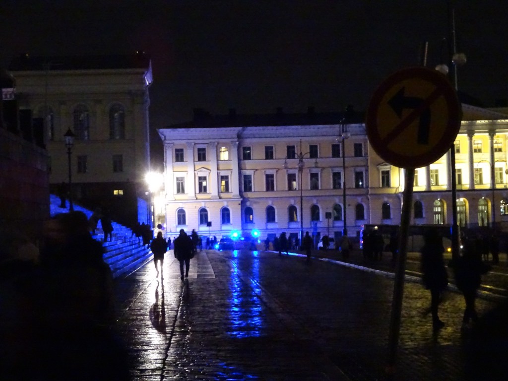 Senaatin torille päin kävellessämme meidät ohitti parikin sinisillä vilkuilaan ja kauhella mölyllään ajavaa ajoneuvoa, väistellen ratikoita Aleksilla.