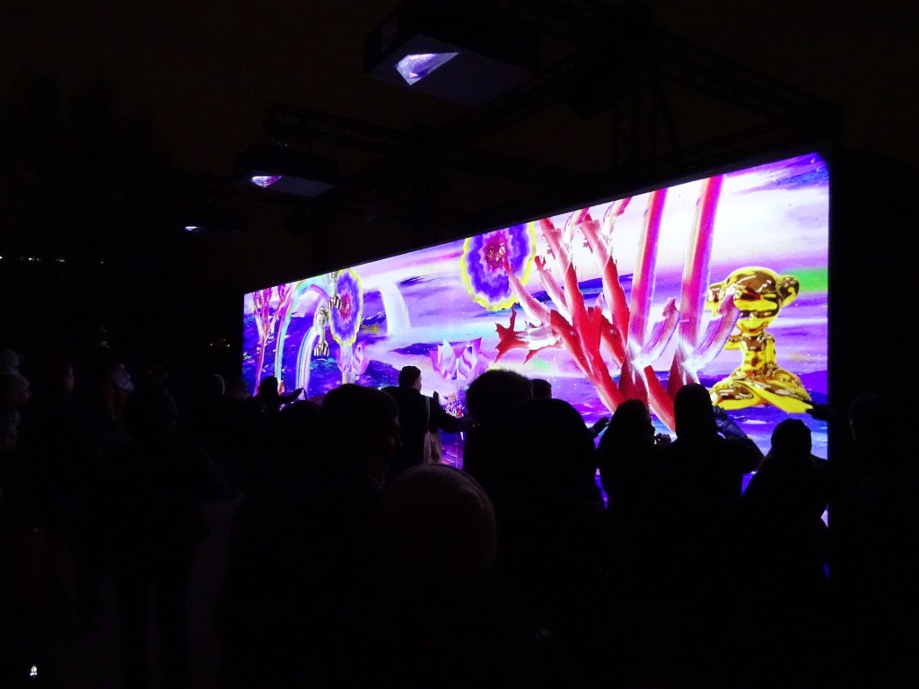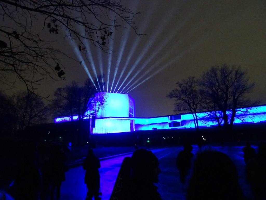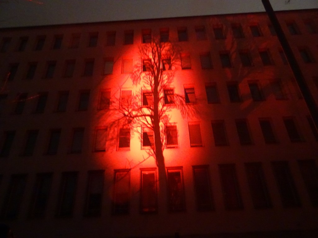Melkoisen muusiikin siivittämänä punasävyinen teos sitten piirtyi talojen seinille. Aika hieno toteutus. Vaikka mielestäni ei lähellekkään edellisvuosien upeita ”liikkuvia” seiniä. Vaan mikäs minä arvostelemaan, mutta sanompa kuitenkin oman mielipiteeni.