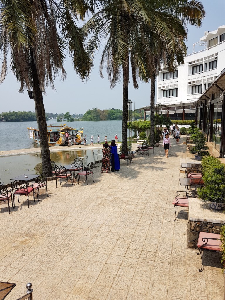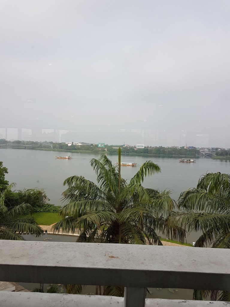 Majoittumisessa ei ollut mitään ongelmaa ja saatiin huone, josta näköala joelle, puutarhaan ja altaalle.