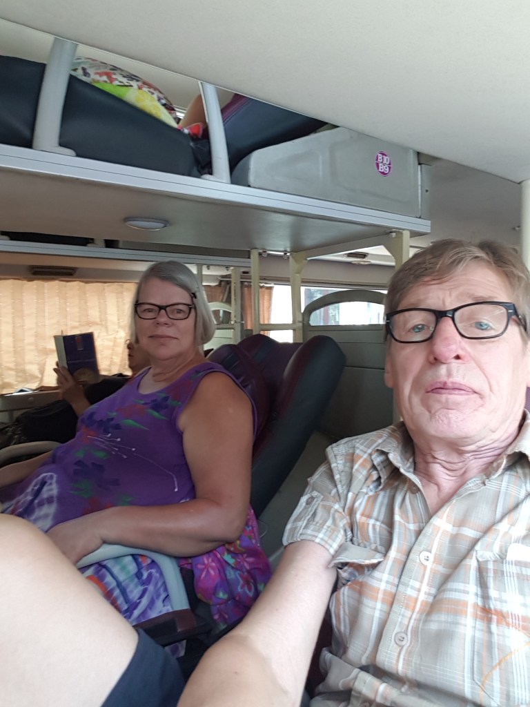 Minä en ollutkaan aikaisemmin matkustanut tämmöisessä vip-bussissa. Penkit menevät tarvittaessa melkein täyteen makuuasentoon, mutta täyteen pystyasentoon näitä ei saa. Miellyttävää matkustamista, joka kuitenkaan ei ole kallista. Olisiko tämä n 60 kilometrin matka maksanut 5-6 € per nenä.