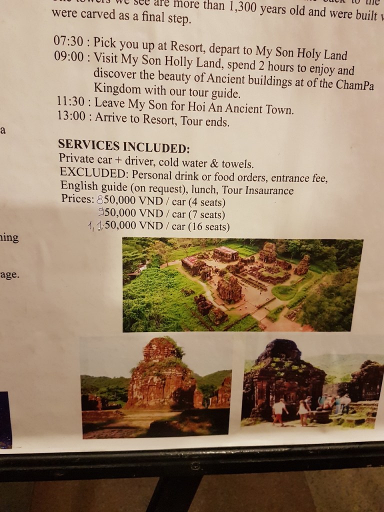 Kun olimme hyväksi havainneet majapaikkamme, respasta tiedusteltiin heti miten päivän retkeä My Son’iin. Olin lukenut paikasta, jonne ehdottomasti halusimme päästä.