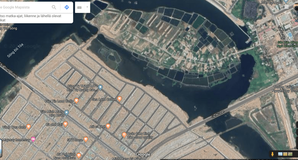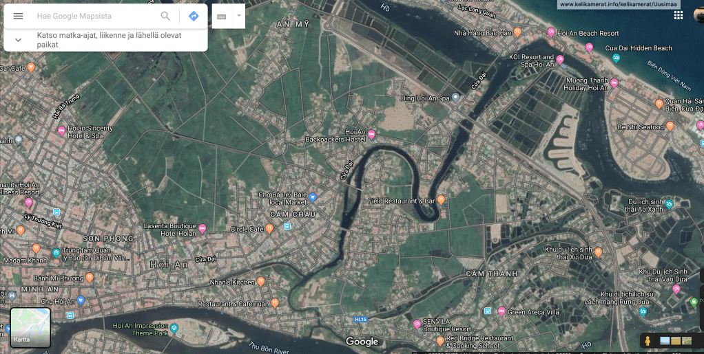 Hotellimme sijaitsee kuvan oikeassa yläkulmassa Hoi An beach Resortin viereinen. Keskusta ja se vanha kaupunki on vasemmalla alhaalla