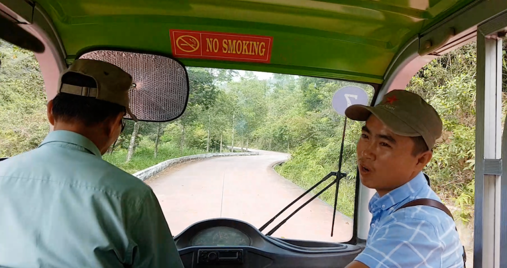 Siitä jatkettiin sähköautolla, melkein kuin jatkettu golf-auto, matkaa ylös, viidakon halki tehdyllä tiellä.