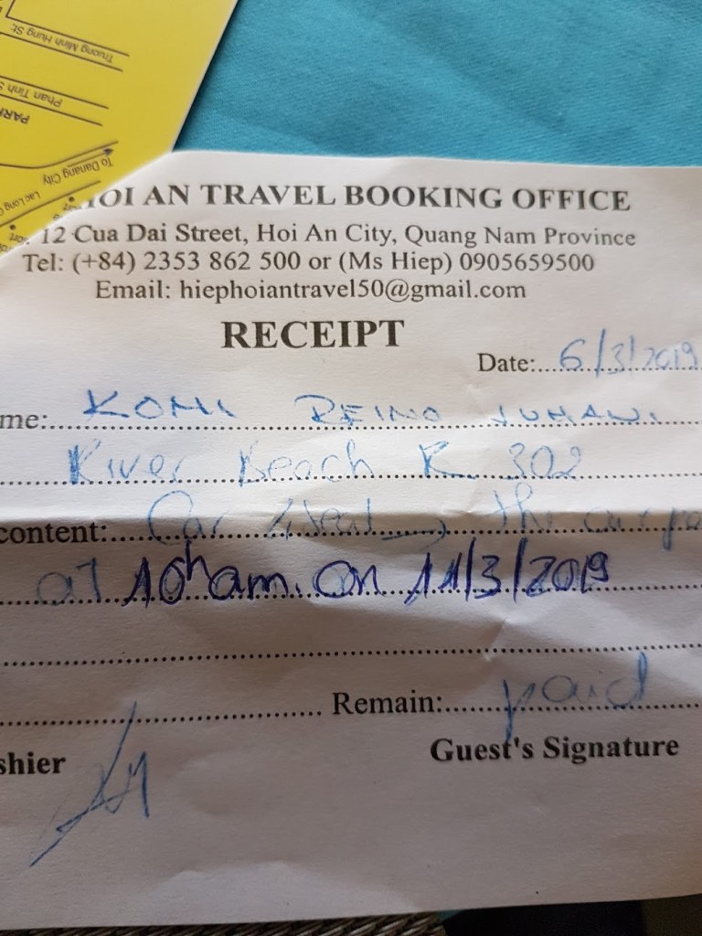Olimme ostaneet ”matkatoimistosta” jopa taximatkan Da Nangiin, jossa lentokenttä sijaitseen, päästäksemme Nha Trangiin.