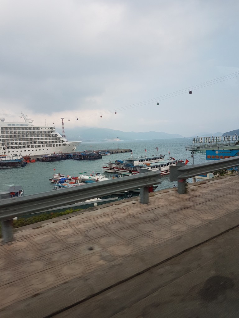 Kuvassa olevat vaijerihissit menevät Vĩnh Nguyên – saarelle, jossa on parempiosaisille suunnattuja resortteja. Mekin tutkailtiin niitä, mutta koska olemma vain kaksi yötä täällä, katsottiin paremmaksi jäädä halpaan pikkuhotelliin kaupungille.