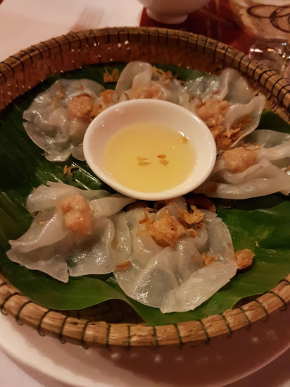 Alkuun otettiin sitten Hoi Anin erikoisuus. Riisistä tehtyjä paperin ohuita, mauttomia, nyyttejä, jotka sitten tuohon liemeen kastettiin. Ei oikein saatu makua näihin. Ei ne nyt pahojakaan olleet, mutta kuitenkin….