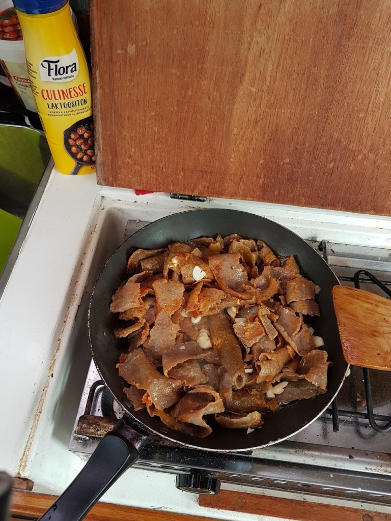 Kello alkoikin olla ruoka-ajan verran, joten grilliin perunat muhimaan, höystettynä aurajuustolla ja pienellä kermatilkalla ja pannulle kebabit lämpiämään.