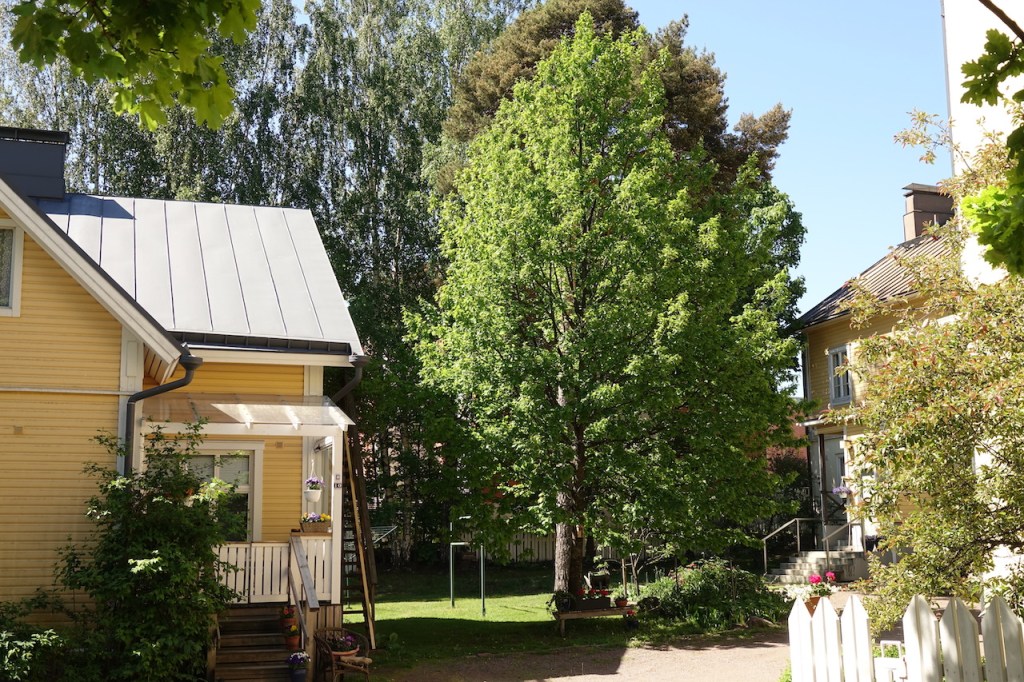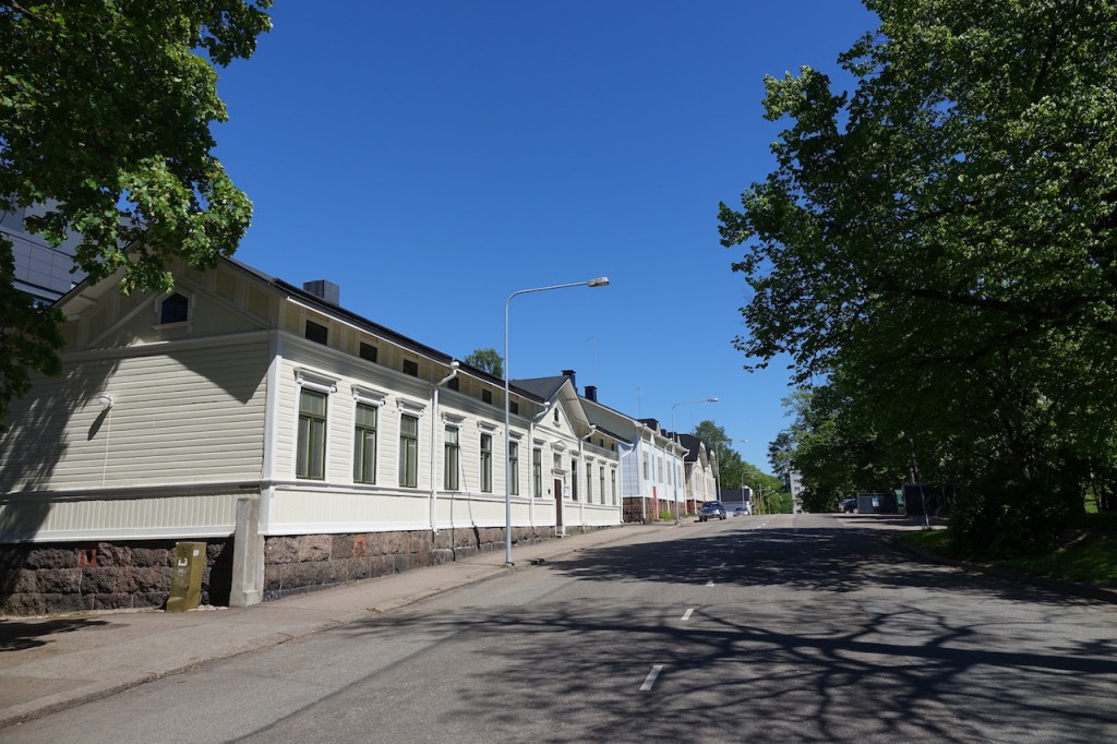 Ison puiston jälkeen katu ja sen varrella olevat puutalot. Kuvaa voisi sanoa ”täydelliseksi” ilman tuota autoa ja valaisinpylväitä. Ja vielä kun olisi hiekkatie.
