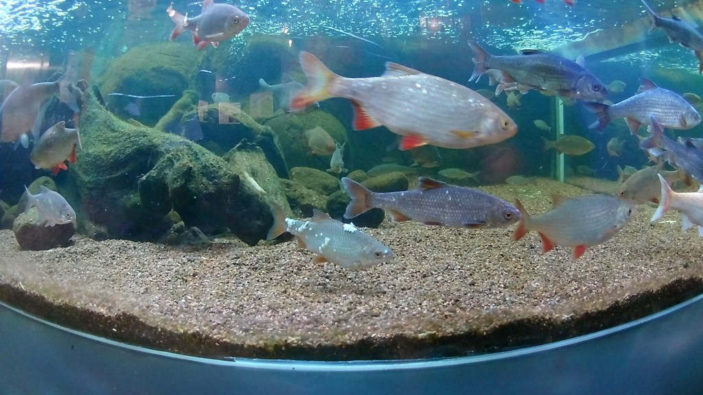 Heti ensimmäisenä tuli vastaan iso allas, jossa on meidän vesialueemme kaloja. Ja onneksi olivat keskittyneet pelkästään meillä Suomessa esiintyviin lajeihin. Vaikuttavaa.