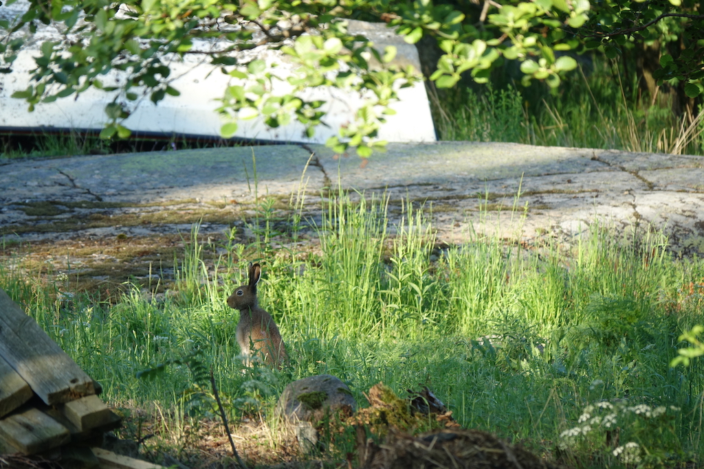 En tiedä, kuinka monta jänistä saarella on, mutta ei tuo yksi ihan joka paikkaan kerkeä. Moneen kuvaan se kuitenkin osui.