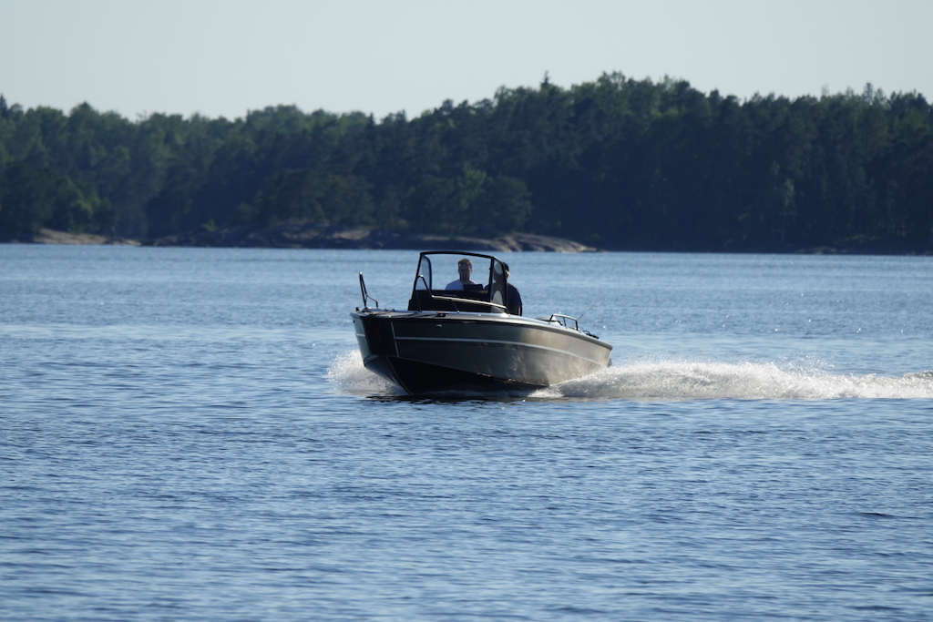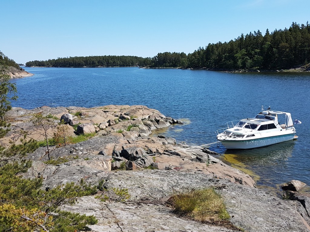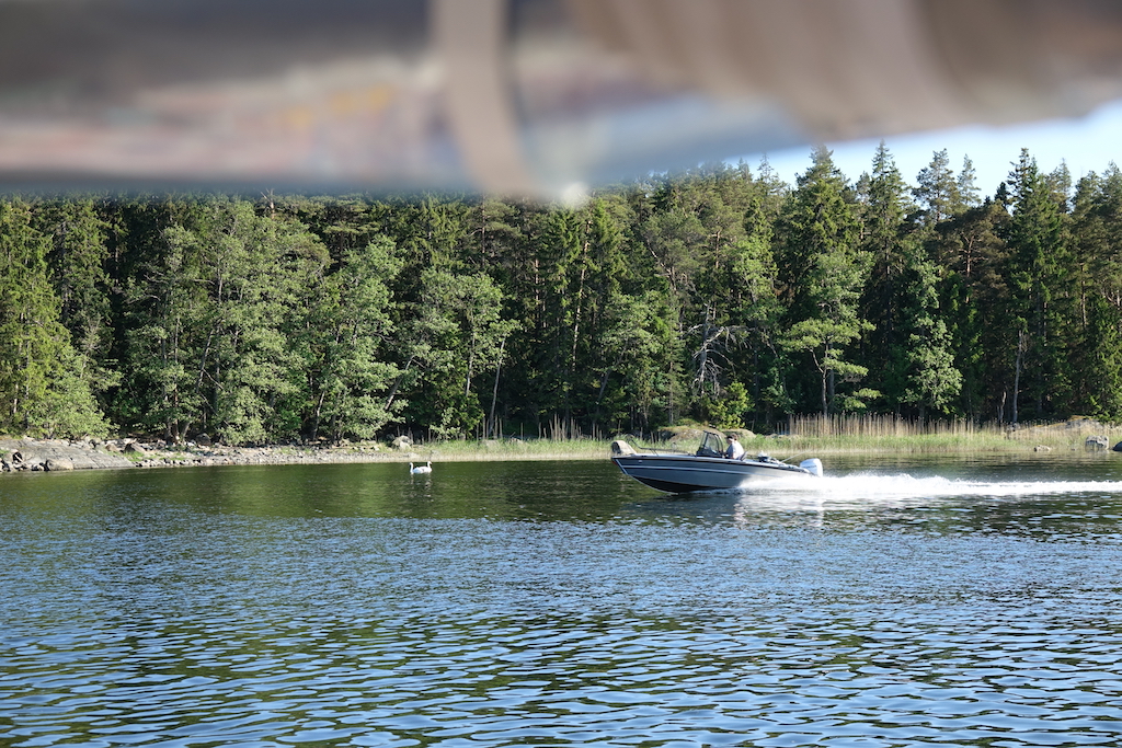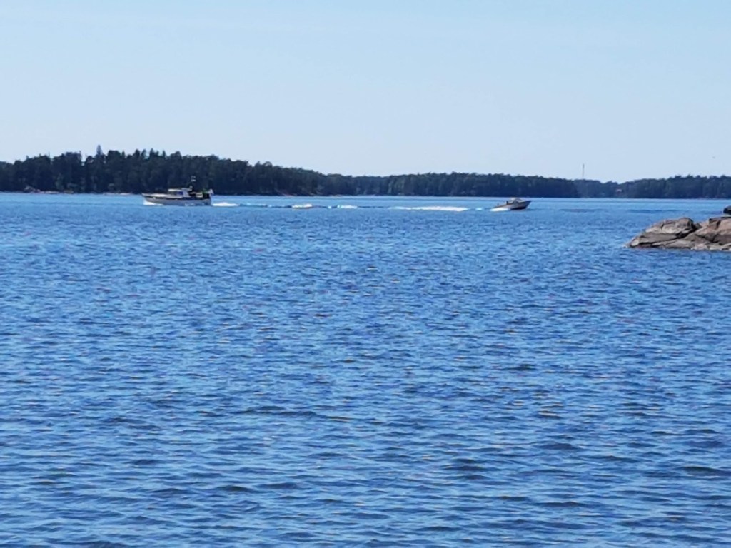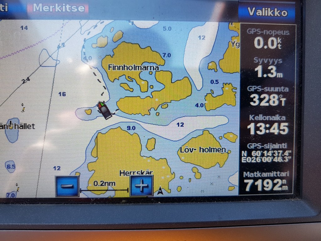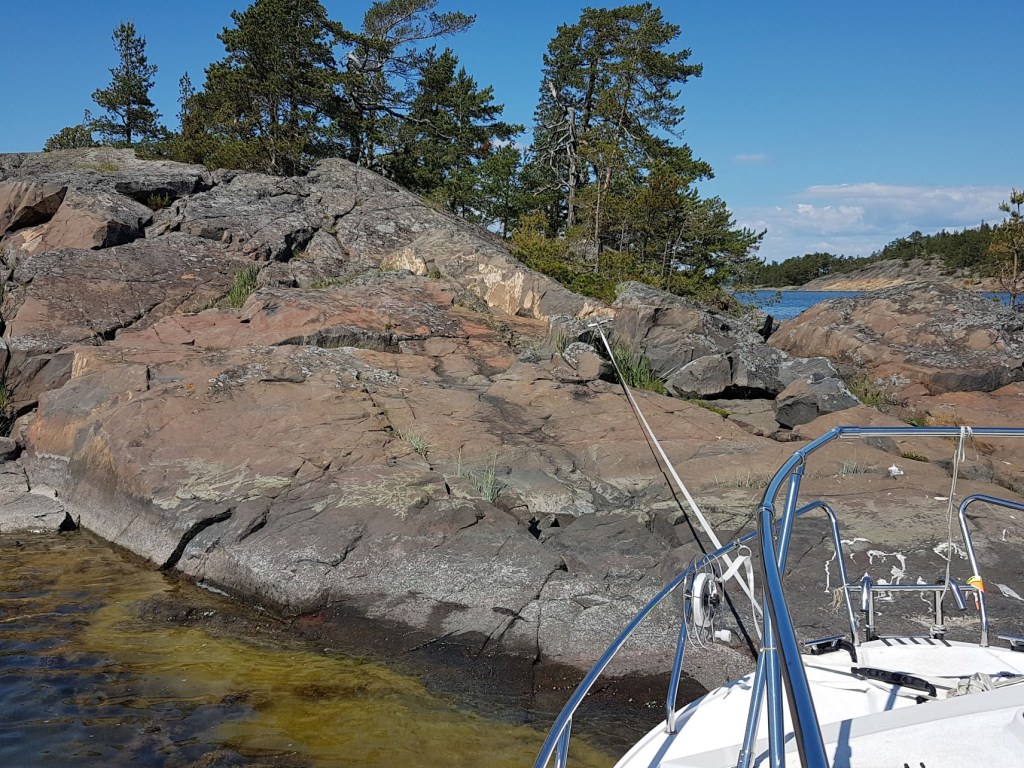 Veneitä menee jonkin verran ohi, lähinnä ilmeisesti mökkiläisten, kun ovat kaikki avoveneitä. Vaikka ovatkin ”pieniä”, niiden aallot saivat keulan muutaman kerran osumaan rantakiveen. Ankkuri oli alun alkaen liian lähellä ja tässä on ankkurin kohdalla 14 metriä vettä. Siispä: Jouduttiin pikkaisen siirtämään paikka ruokailun jälkeen, kymmenkunta metriä saaren itäkärkeen.