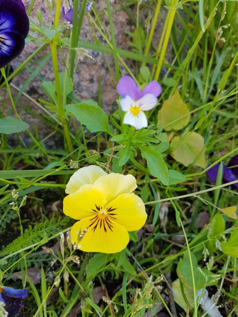 Siinä oli kahta kokoa olevia. Minun kasvituntemukseni ei riittänyt tekemään isompaa analyysiä lajien eroavaisuuksista muuta kuin, että isoterälehtiset mielestäni istutettuja ns puutarhaversioita ja nuo pienemmät, joita saaressa melkein joka puolella, ovat metsäorvokkeja. Kauniita kumpaisetkin.