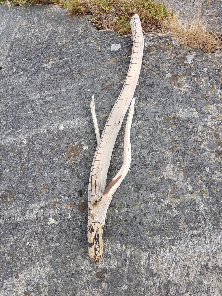 Joku oli askarrellut kivan kalan rantaan ajelehtineesta oksasta.