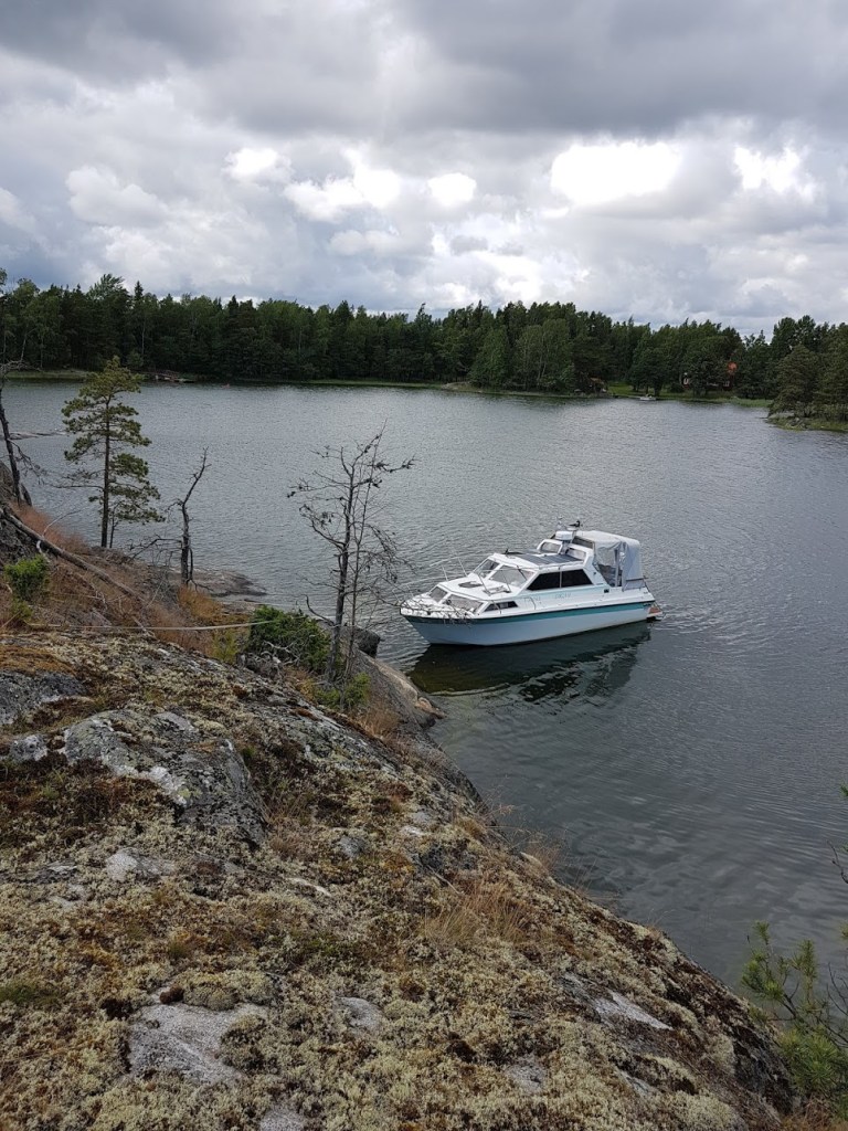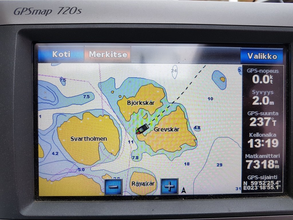 Vaikka emme ennen tässä saaressa ole käyneetkään, eilinen pohjatyö tuotti tulosta. Osuttiin melkeinpä heti hyvään kiinnitymispaikkaan. Tuossa sinisen veden alueellakin oli vettä alimmillaan 5 metriä.