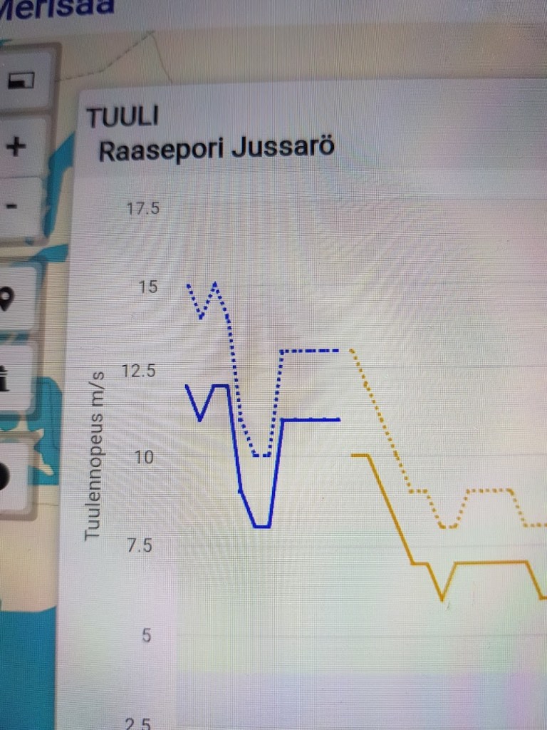 Tuulirako sattui meille aika edukkaaksi, eli siina 8 m/s oli vastaista tänne ajaessamme. Vain hetkeä myöhemmin, kun jo olimme ankkuroituna ja kiinni saaressa, voimistui yli kymmeneen.
