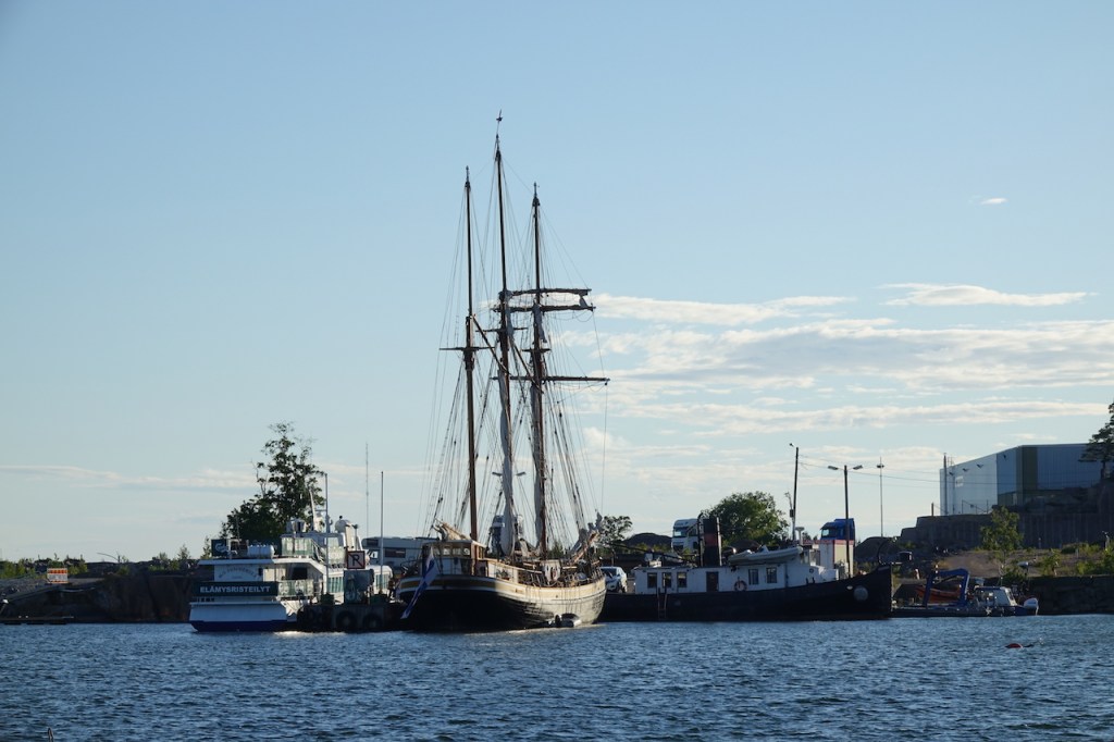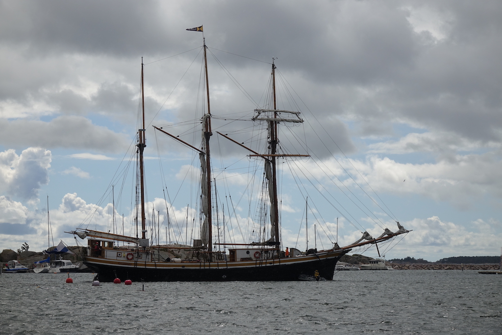 Aika iso purjelaiva saapui satamaan. Saapi ihailla kipparin ammattitaitoa, miten hienosti sai voimakkaassa sivutuulessa laivansa kiinnitettyä laituriin. Laituri on tuulen yläpuolella, joka lisää haastetta sitten ihan pikkuisen.