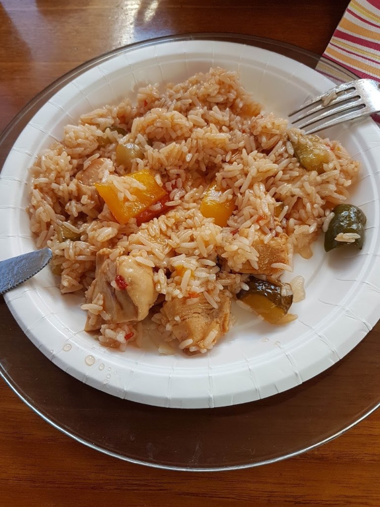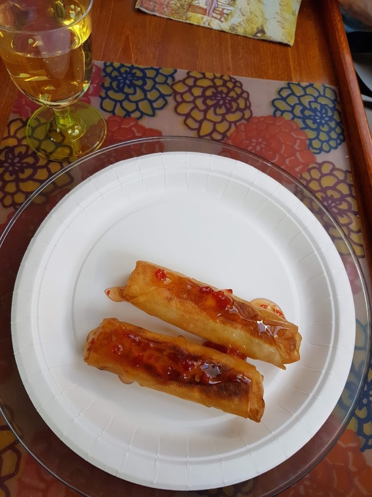 Viime vuonnakin ostettiin samaisesta thai-snägariltä mukaan annokset. Nyt viime kerrasta viisastuneena, ostettiin vain yksi lämmin annos ja hyvin riitti kahdella. Riisiä jäi jopa pari lusikallista.