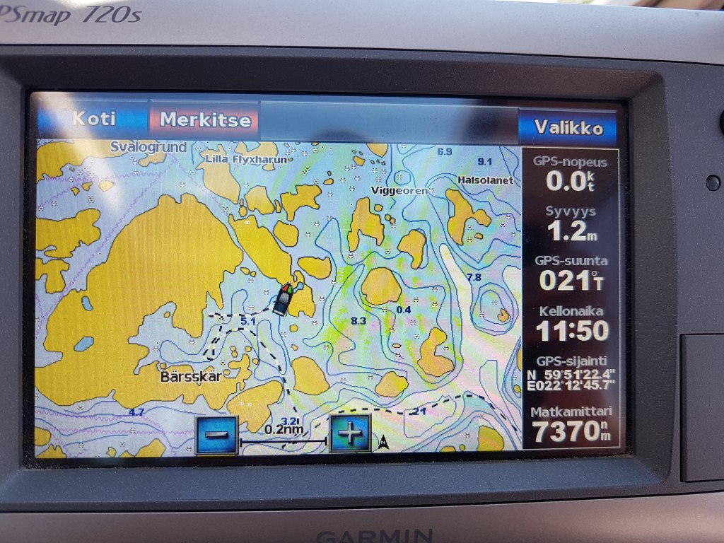 Vaikka syväys näyttääkin vain 1,2 metriä, voi tähän tulla mielestäni vaikka purjeveneellä. Meillä on anturi laitettu niin eteen. Nytkin n neljä metriä kalliosta.