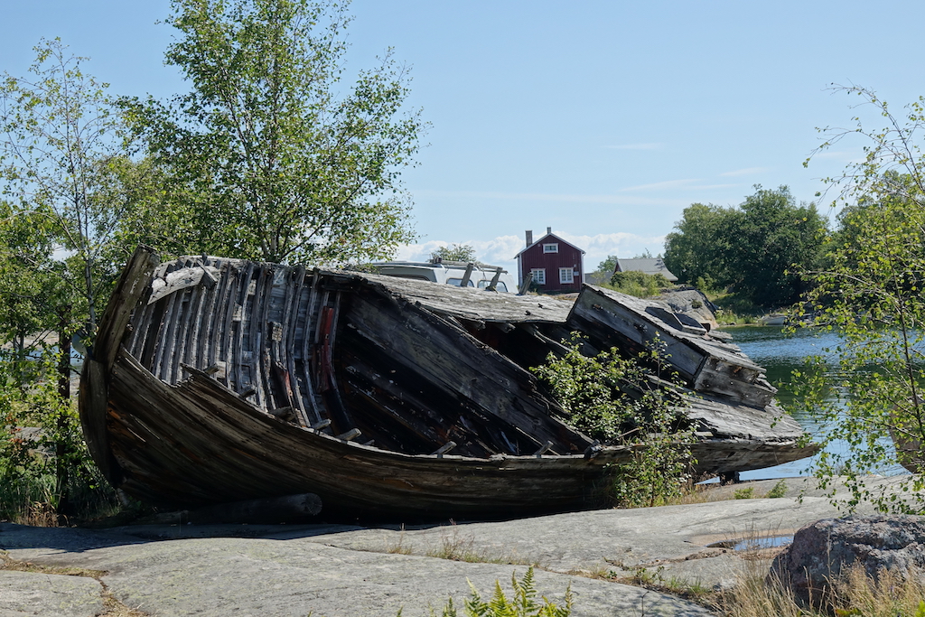 Kaupan edessä pikkaisen kärsinyt ja paljon merta nähnyt vene. Iso oli, noin 12 metriä.