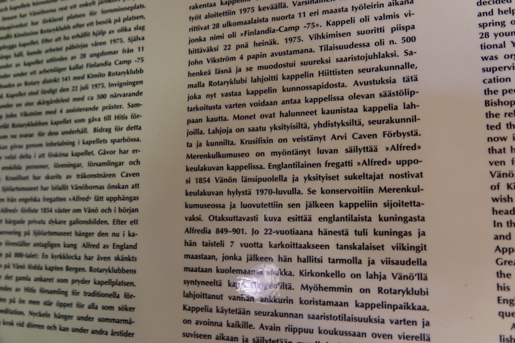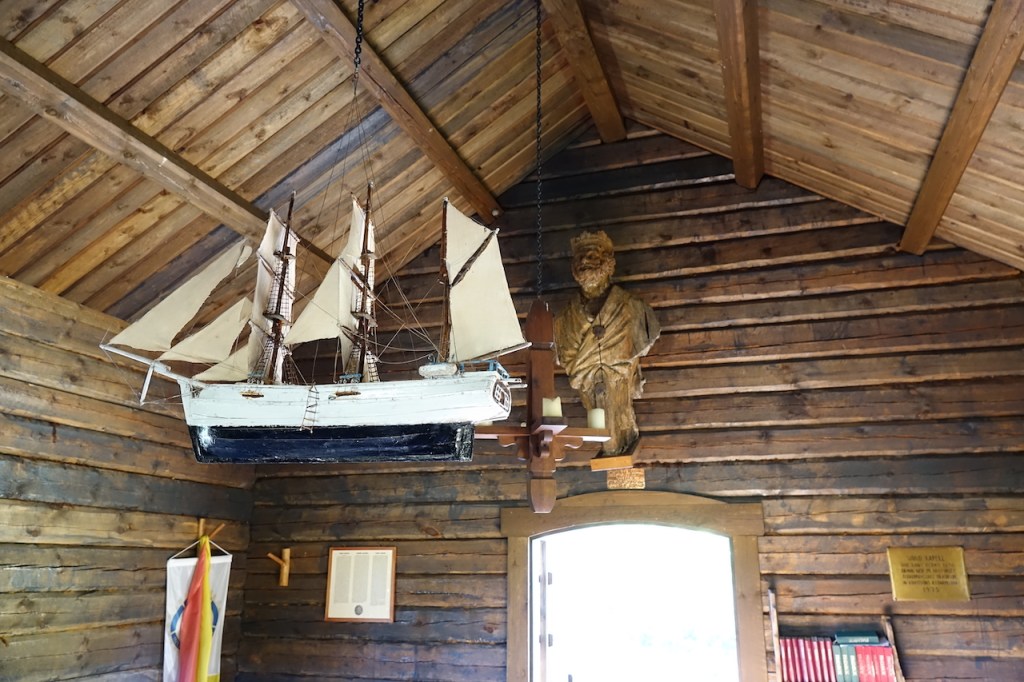 Kirkkolaivan keulakuva on englantilaisesta Alfred-fregatista, joka tuhoutui 1854 Vänön länsipuolella, nostettu 1970-luvulla . Kuva esittää Englannin kuningas Alfred Suurta, joka eli 1800-luvulla ja taisteli tanskalaisia viikinkejä vastaan.