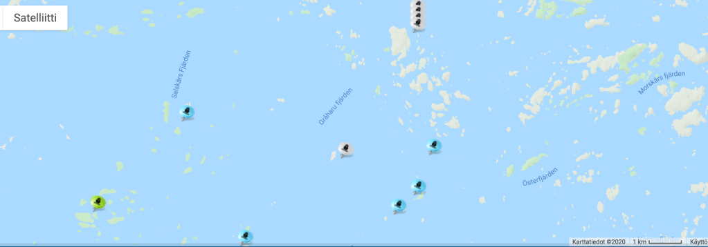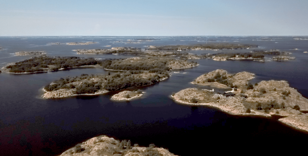 Kuvassa näkyy hyvin tuo lahdukka oikean puoleisessa saaressa, johon meidän piti mennä. Isot laiturit tehty, eikä meiltä mitään kyselleet ; – )