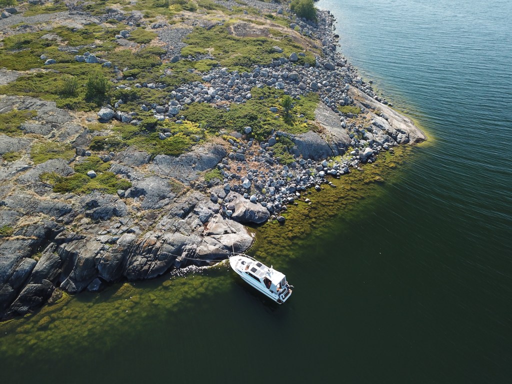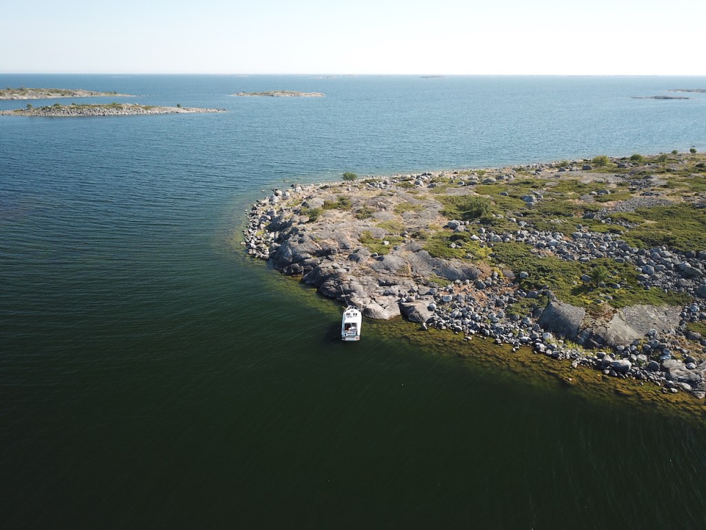 Se, että vesi on täällä kirkasta, auttaa ilmakuvauksessa myöskin polarisoiva suodatin, jolloin matalikot ja kivet näkyvät hyvin. Tällä tavalla välillä etsin toista, parempaa ankkurointipaikkaa joko samasta tai viereisestä saaresta.
