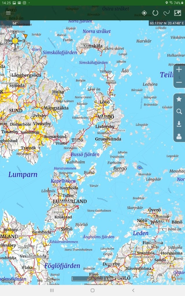 Alakuvassa olemme tuossa sinisessä pisaran muotoisessa täplässä, Bergön itäpuolella.