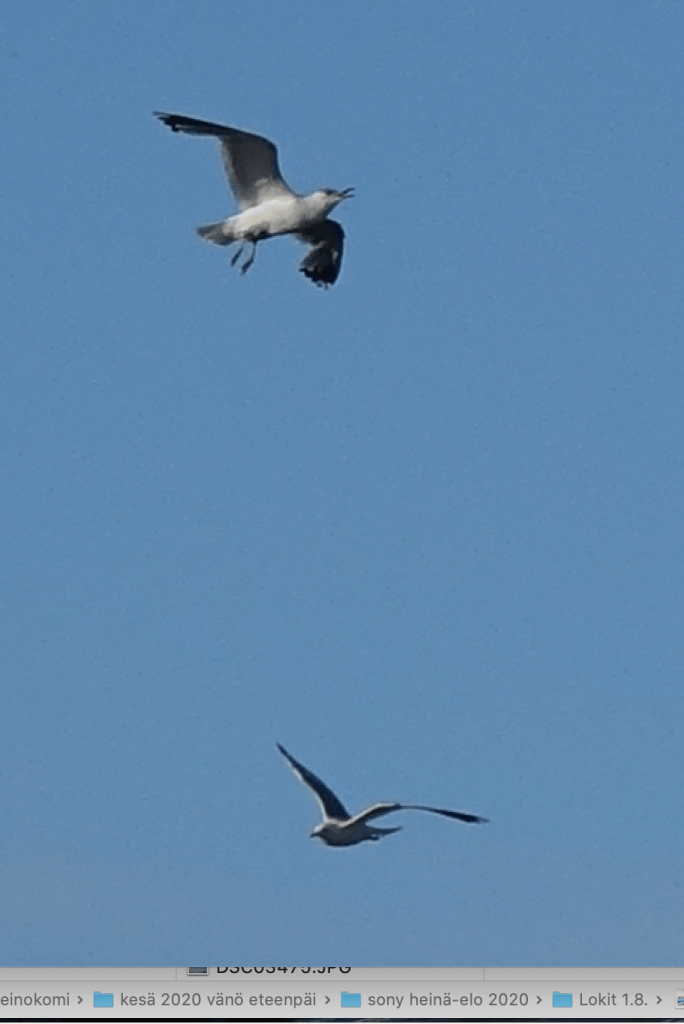 Alakuvassa näkyy hämärästi lokin nokan edessä pikkuinen lentävä, joka kohta juituu parempiin suihin.