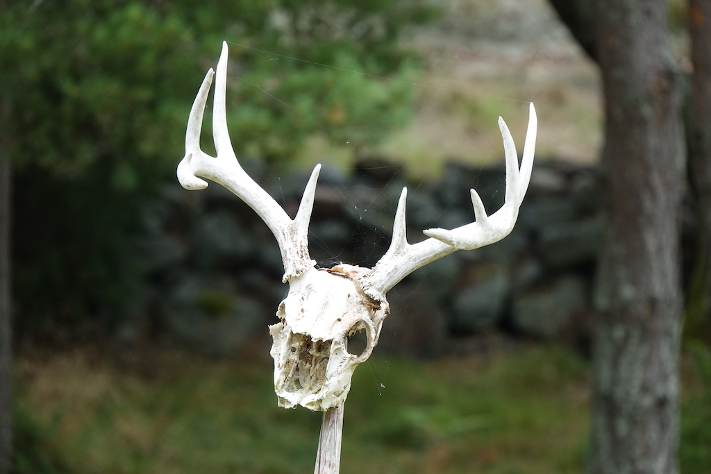 Erään pienen perunapläntin yhteen nurkkaan oli hirven pääkallo laitettu. Kait pelotteeksi muille. Eli jos tuut mun perunamaalle, näin käy 😉