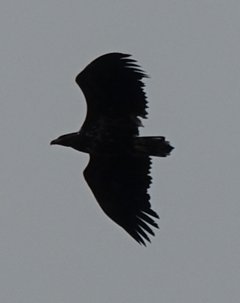 Ja välillä kun ilmoille katsahtaa, saattaa täällä nähdä merikotkankin. Nähtiin tämä eilenkin, mutta silloin ei ollut kuin kännykkä mukana. Nytkin oli julmetun kaukana, joten zoomauksesta tehty suurennos, niin rakeiseksihan se menee.