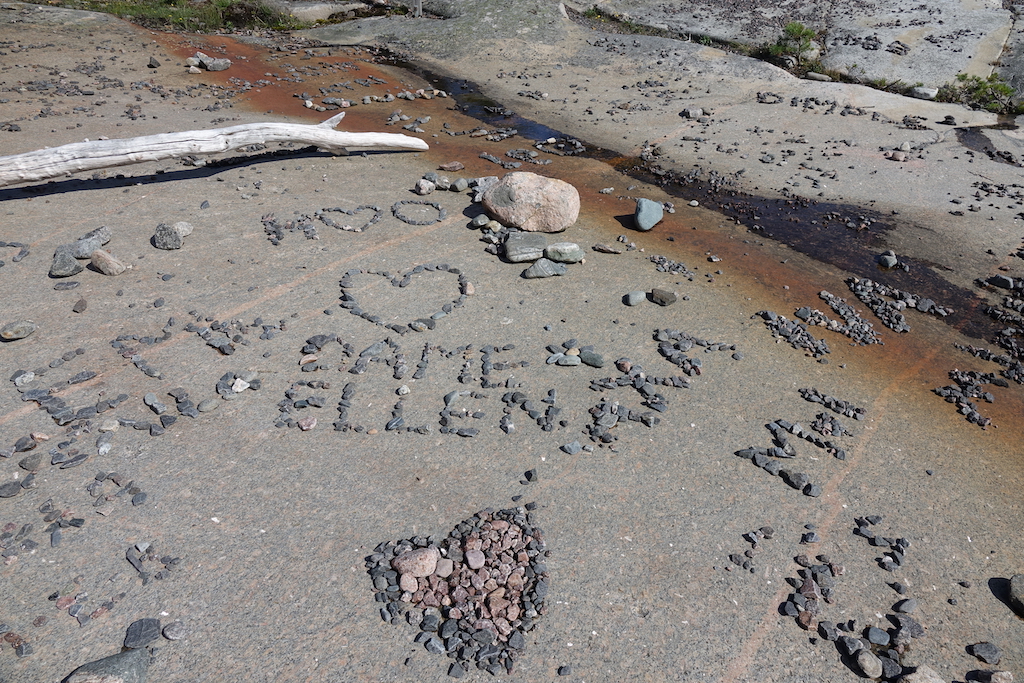 Noista sormenpään kokoisista pikkukivistä kirjoitelleet nimiään tai mitä lie sileälle kallio-osuudelle.