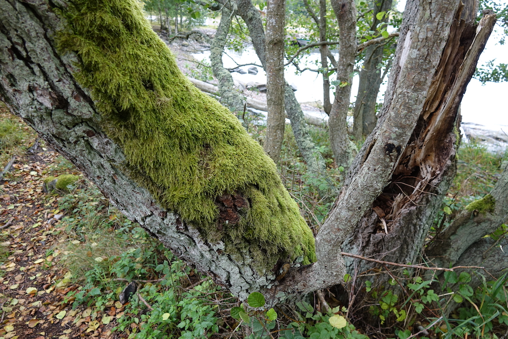 Polun varrella, laiturin läheisyydessä, on vanha leppä, joka on saanut peitokseen sammalta.