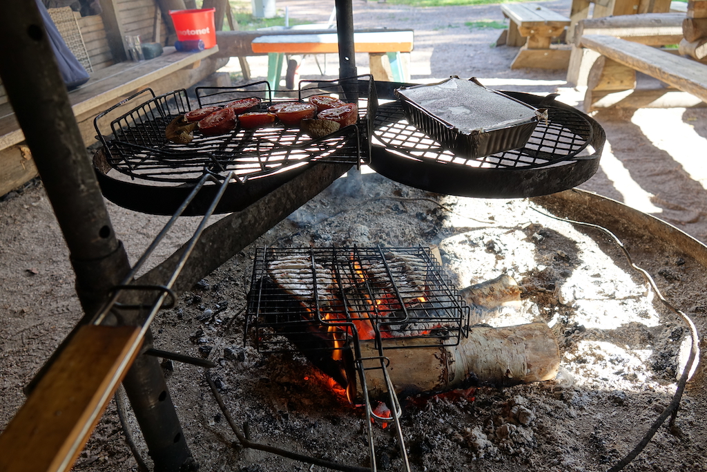Tuossa hiilloksessa ei kauan tarvitse tipujen palat olla, kun kypsäksi tulevat. Onneksi olin vähän ennen tuota tajunnut, että lautaset ja syömävälineet olivat unohtuneet veneeseen. Kipaisin hakemassa ja pöytä alkoi olla katettuna.