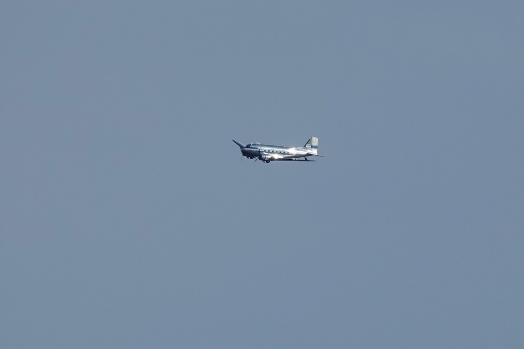 Kun päästiin saaren lounaiskärkeen, kuulin matalaa mouruamista. Ensin luulin jonkun armeijan laivan lähenevän, mutta kun sellaista ei näkynyt ja ääni lähestyi, tajusin sen tulevankin taivaalta. Ennen kohteen näkemistä tunnistinkin äänen, joka ei voi tulla muusta kuin DC 3:sta.