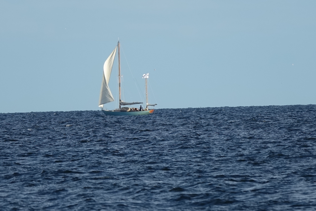 Upea ketsi pelkällä genualla lipui uljaana väylällä. Tuossa kyydissä kuulee ajatuksensa, kun ei ole mitään, mikä meteliä aiheuttaa. Paitsi ehkä pieni purjeiden läpätys välillä.