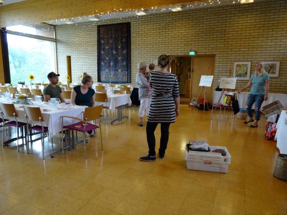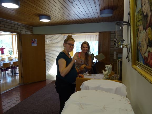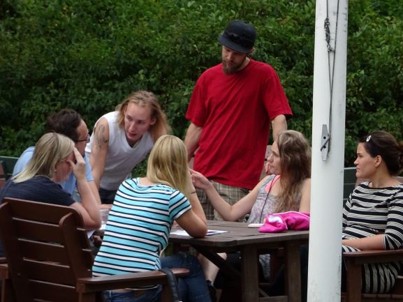 Majoitusvastaava piirtelee nimiä majoitustilojen pohjapiirrustukseen. Meni pikkaisen uusiksi, koska me oltiinkin kaksi yötä ja muut yhden. Me tullessamme olimme saaneet samanlaisen ja valinneet jo yhden huoneen, tietämättä, että se oli ajateltu jo joillekin muille.