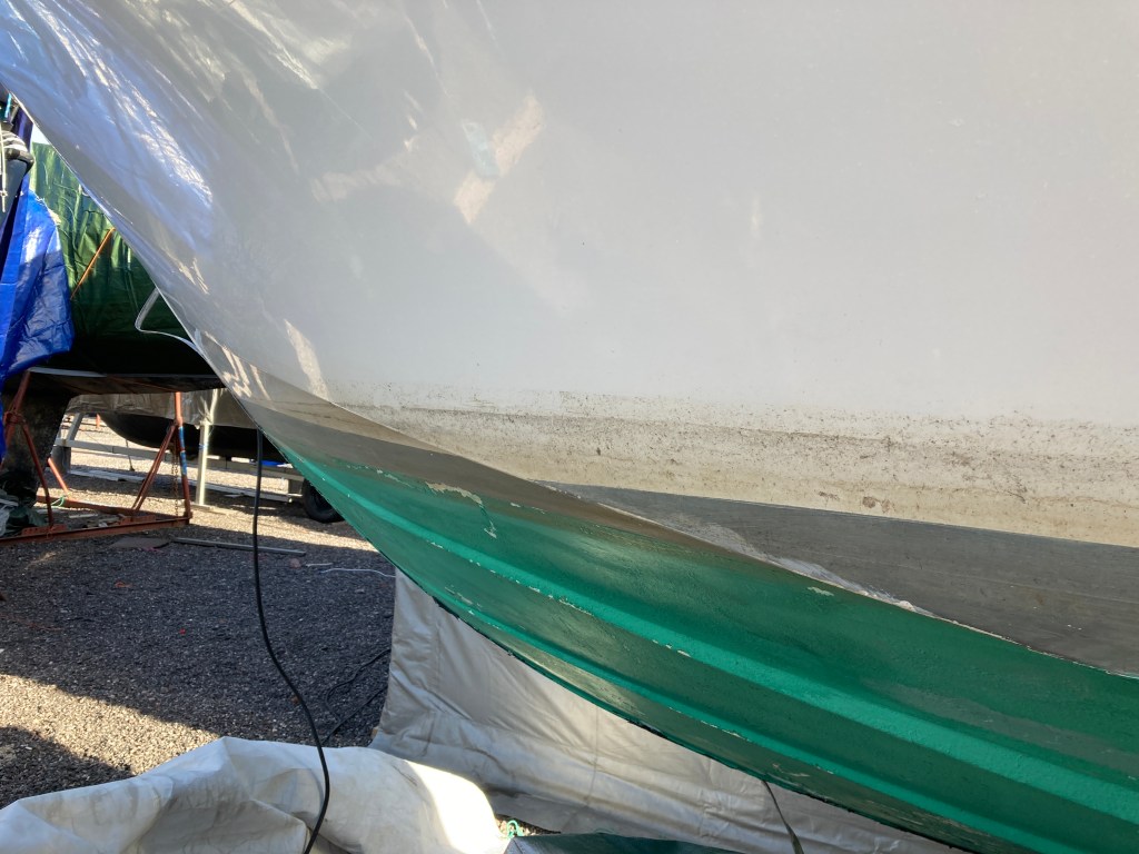 Tuossa veneen kylkiä pällistellessäni mietiskelin, pitäiskö vesirajan maalausta nostaa, kun tulee tuota ruskeaa kauniiseen kylkeen.